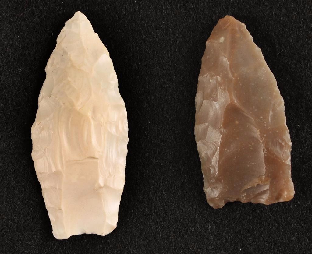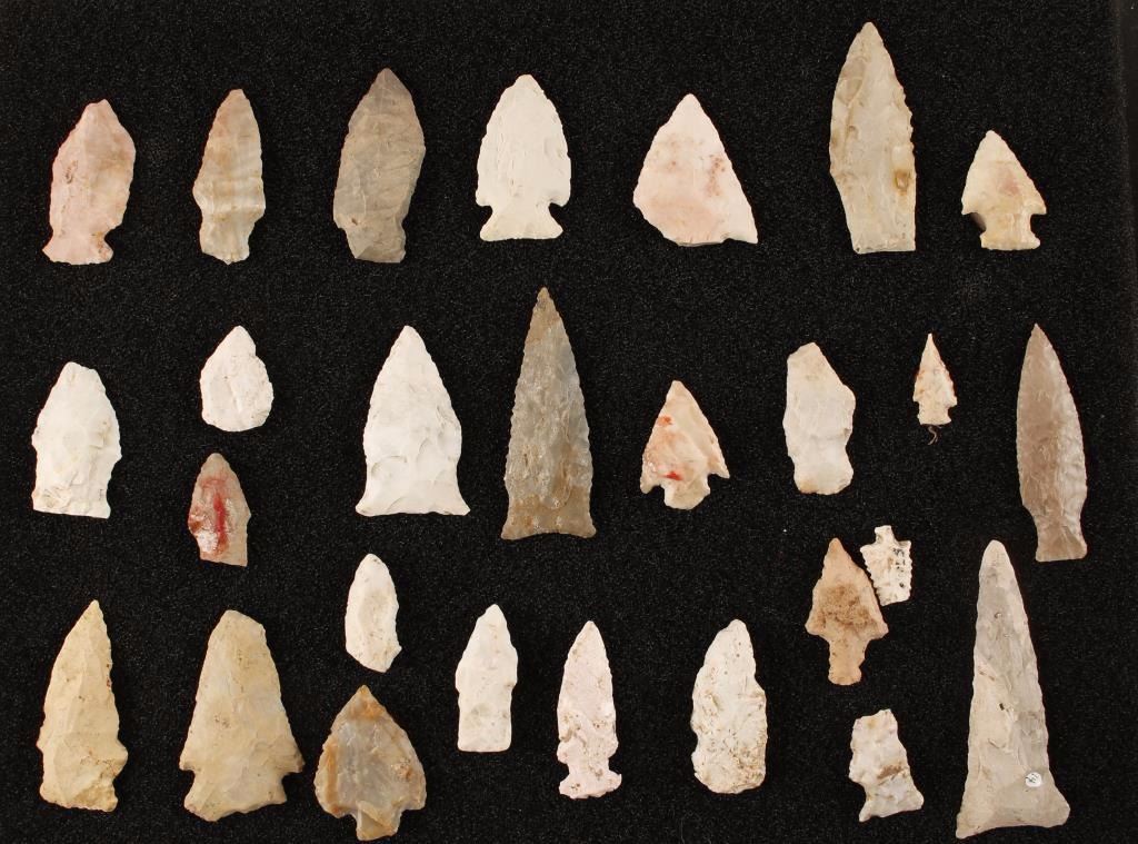 Two large points in display box labeled "Ex. Robert Boyd, Illinois Clovis and 27 points in display box of various sizes. Unknown age or origin, various types of stone.