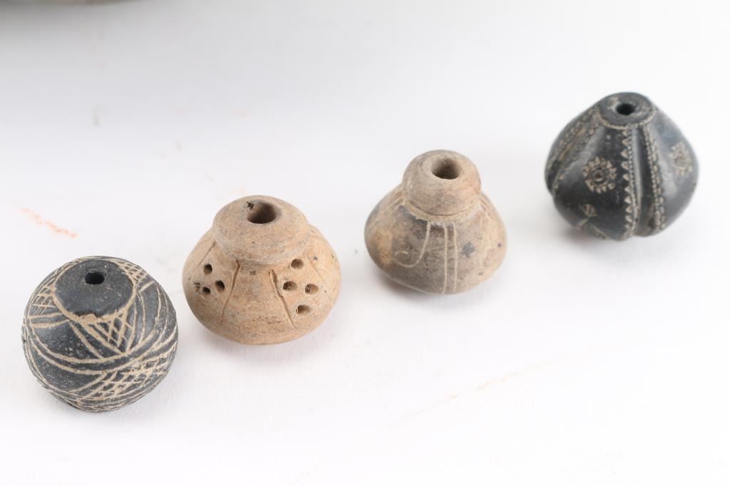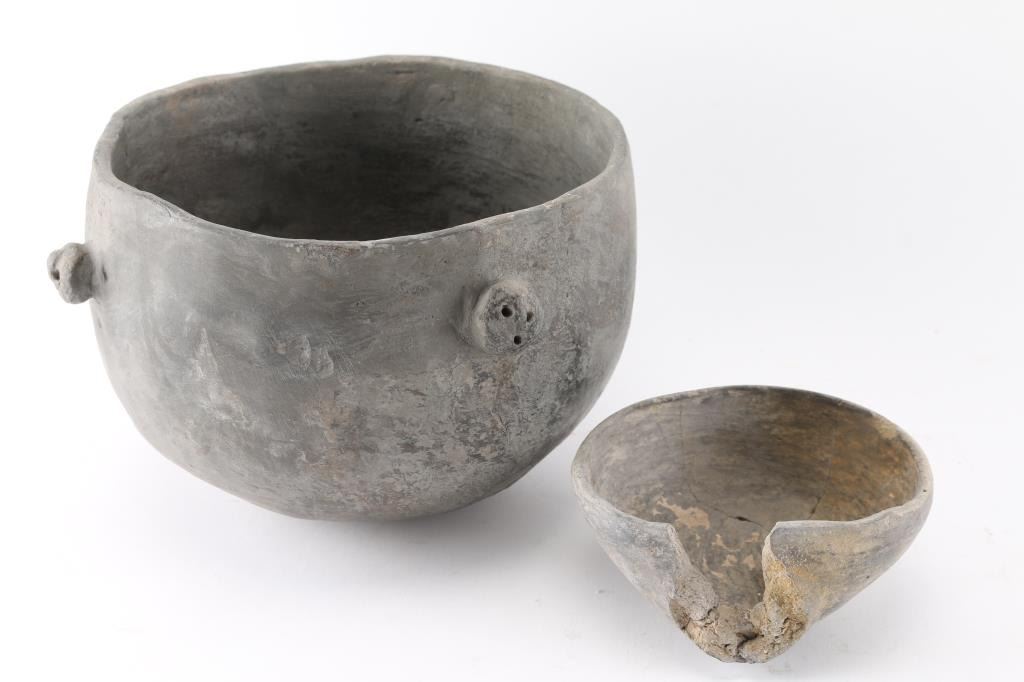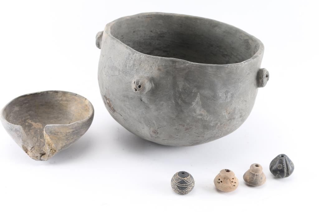 Large pot, repieced together, possibly from the Mississippi Ground Builders Culture. Has 4 three dimensional faces spaced just below rim around body of pot. Measures 6" tall and 8" circumference. A smaller pot is broken where a protrusion existed. It measures 2" tall by 4 1/2" around. Plus 4 spindle whorls, two from the late prehistoric Sahara Desert phase and two from the Manteno Culture in Ecuador,