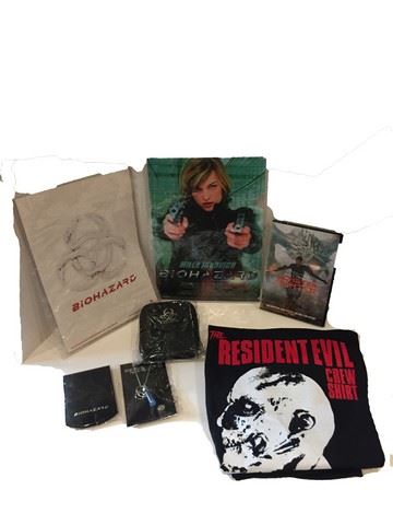 Lot of promotional items from the producer's offices. Includes a sealed Monster Hunter DVD, Biohazard laminate sticker, Biohazard mini one sheet, Biohazard phone holder/small case, Biohazard II collectible logo necklace with vial, Biohazard wallet and a Resident Evil crew shirt (m).