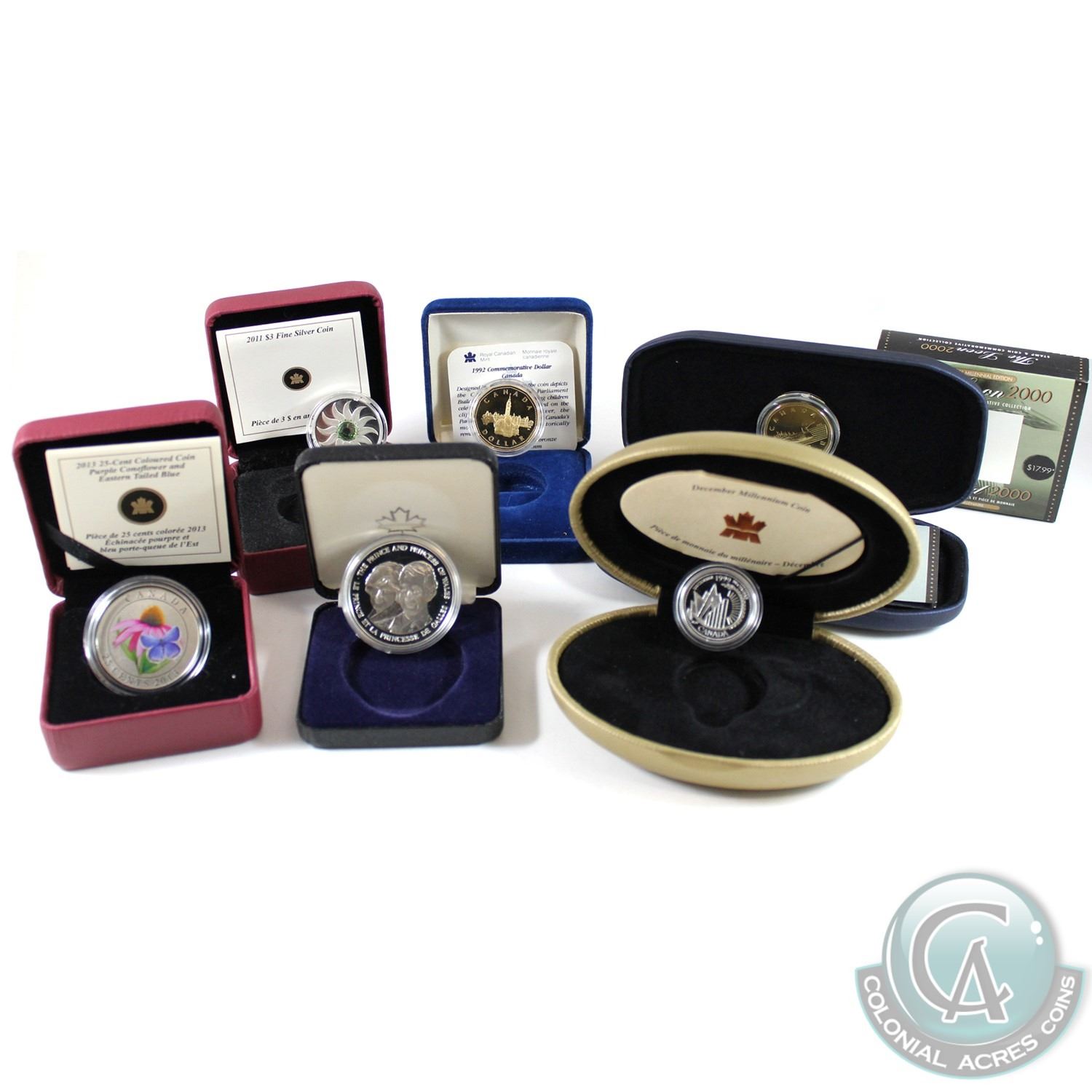 Lot of RCM Issued commemoratives: 1983 Charles and Diana Medallion, 1992 Parliament Loon ( cracked capsule), 2000 December 25-cent proof, 2000 special edition millennium Loon stamp and coin set,2011 $3 August (Peridot) Birthstone & 2013 Canada 25-cent Purple coneflower and eastern tailed blue butterfly. Each coin comes encapsulated with clamshell display. display contain minor imperfections. 6pcs