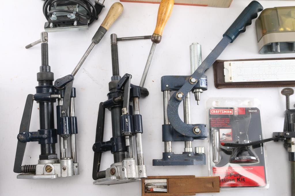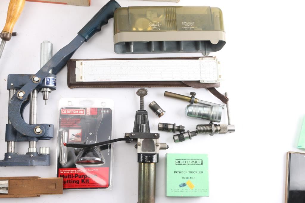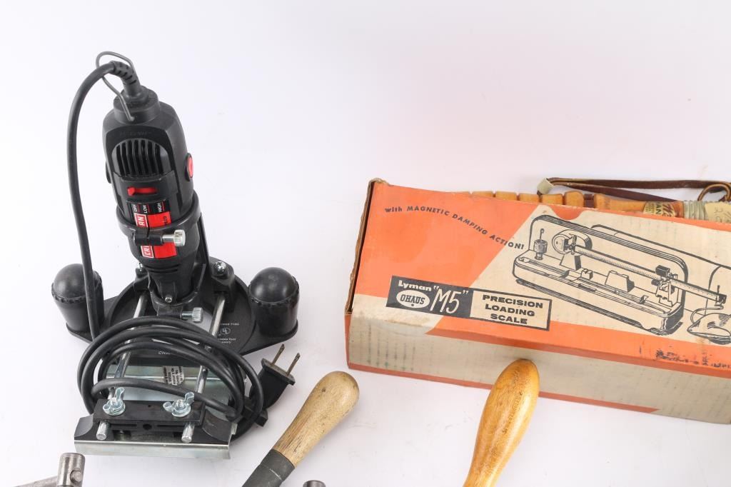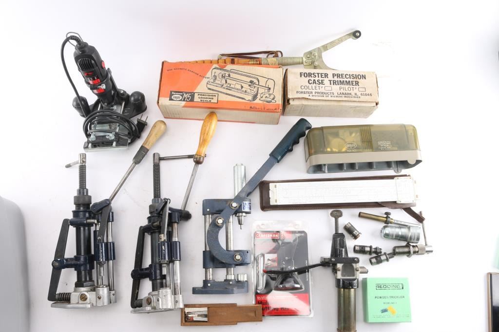 Includes: Forster case trimmer, Lyman scale, Craftsman router, (3) presses, and other tools.