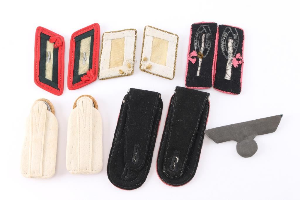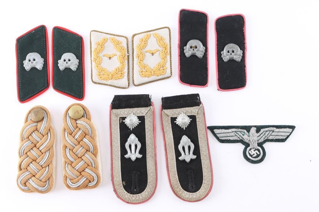 (1) set German Luftwaffe General Major tabs. (1) set Waffen Elite General's shoulder board. (2) sets German Panzer collar tabs. (1) set shoulder boards for Panzerjager unit. (1) set Wermacht shoulder boards. (1) German Officer's Hoheitsabzeichen.