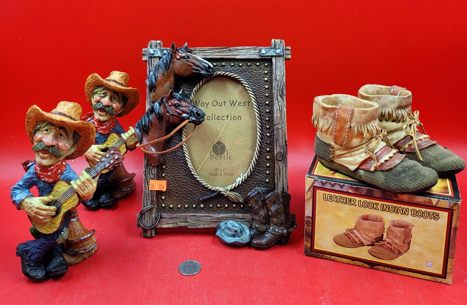 Lot of Resin Western Decor w/ Picture Frame, Leather Look Moccasins, & More