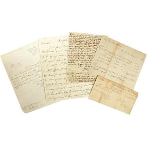 <B>Revolutionary War Officers and Staff under George Washington </B></I> This lot of five documents includes:<BR><B>Joseph Reed Bank Draft Signed</B></I> 1 page, 7.25” x 4”, Philadelphia, April 1, 1779. Written in another hand but signed “<I>Jos. Reed / President”</B></I> as President of Pennsylvania’s Supreme Executive Council. <I> </B></I>Joseph Reed (1741-1785) served as Washington’s military secretary. <B>Condition</B></I>: good with folds, some staining and corner chips<BR><B>Robert H. Harrison ALS,</B></I> 3 pages, 6” x 7.5”, March 12, 1788. This letter written by Washington aide Robert H. Harrison (1745-1790) is boldly signed <I>“Rob: H: Harrison”</B></I>. <B>Condition</B></I>: fair-good with staining, a tear at the spine, and a 1-inch hole left by the original wax seal<BR><B>Ralph Izard ALS</B></I> 3 pages, 7.5” x 9.75”, New York, October 19, 1789, signed <I>“Ra. Izard.” </B></I><B>Condition</B></I>: very good with folds and a slight bit of browning at the edges<BR><B>Aaron Ogden Transportation Receipt Signed</B></I> Two pages, 7.75” x 6.25”, July 25, 1800. Partly written in another hand, this receipt signed <I>“Aa. Ogden”</B></I> by Continental Army officer Aaron Ogden (1756-1839) dates to his tenure as a lieutenant colonel in the new U.S. Army (1799-1800). In his later years, he continued as a transportation executive, running a steamship company that eventually was bankrupted by competition from James Fulton and Robert Livingston. <B>Condition</B></I>: good with folds, some staining and minor wear at the top edge<BR><B>Tobias Lear ALS,</B></I> 1 page, 7.75” x 9.75”, July 22, 1816, written less than two months before his death. At the time of writing, Lear was serving as Secretary of War in the James Madison administration. Signed <I>“Your Mo. Obed. Servt: Tobias Lear.” </B></I> <B>Condition</B></I>: good with folds, minor stains and chipping on the bottom corners<BR><BR><b>Shipping:</b> Flat Material, Small (<a target="_blank" href="http://www.heritageauctions.com/common/shipping.php">view shipping information</a>)