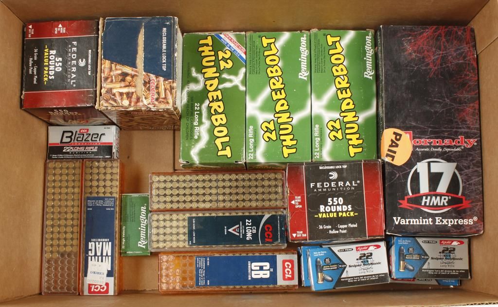 3807 cartridges. 500 rounds of 17HMR. 1400 rounds of Remington .22 LR Thunderbolt. 1200 rounds of Federal .22 LR.. 24 rounds of Blazer .22 LR, 1 CCI .22LR shotshell, 6 Remington .22 LR. 187 rounds of Aguila Sniper Subsonic .22LR. 172 rounds of CCI CB .22 Long. 13 rounds of CCI CB caps and 57 rounds of CCI .22 short. 100 rounds of CCI MiniMag .22 LR ammo. 47 rounds of Remington .22 Short.