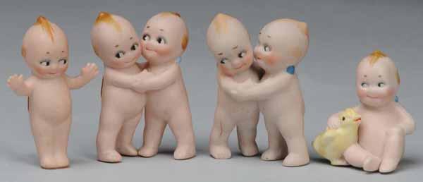 Description Germany, Ca. 1913. Sitting Kewpie with duck, standing Kewpie with label on back, pair of Huggers made in Germany with label, along with a pair of Huggers made in Japan. Condition (Excellent). Size All: 2 - 1/2" T.
