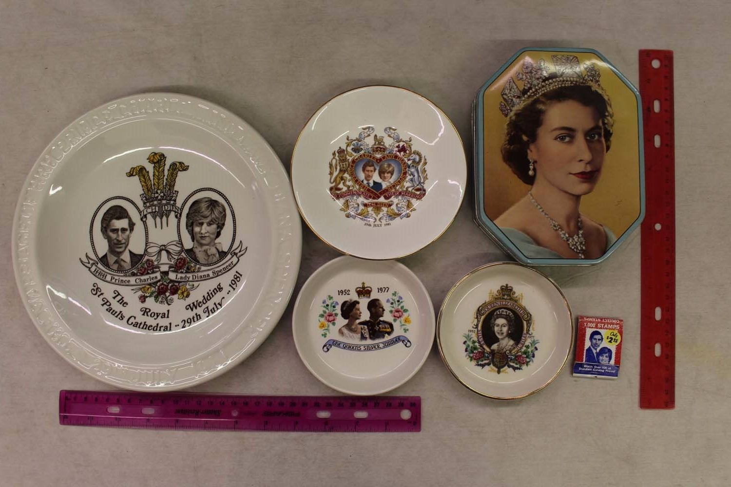 Lot of Royalty Items: 4 Plates, 1 Tin& Matches