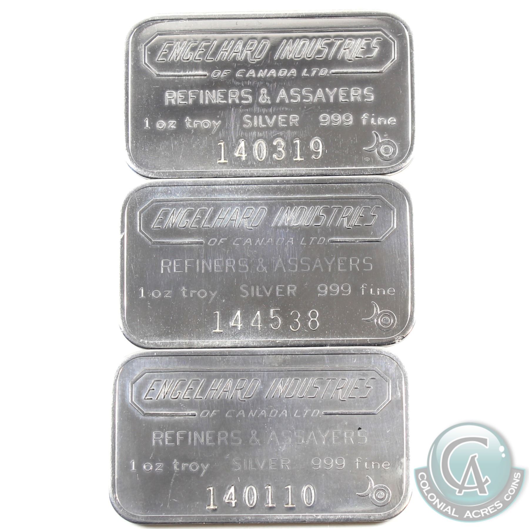 Lot of Scarce Engelhard Industries Canada 1oz Fine Silver Bars with '6 digit #' and Bull Mark (TAX Exempt). Serial #140319, 144538, 140110. 3pcs.