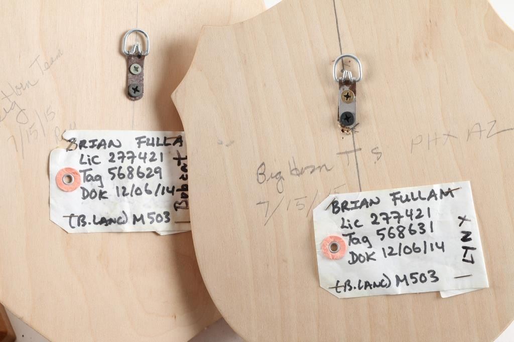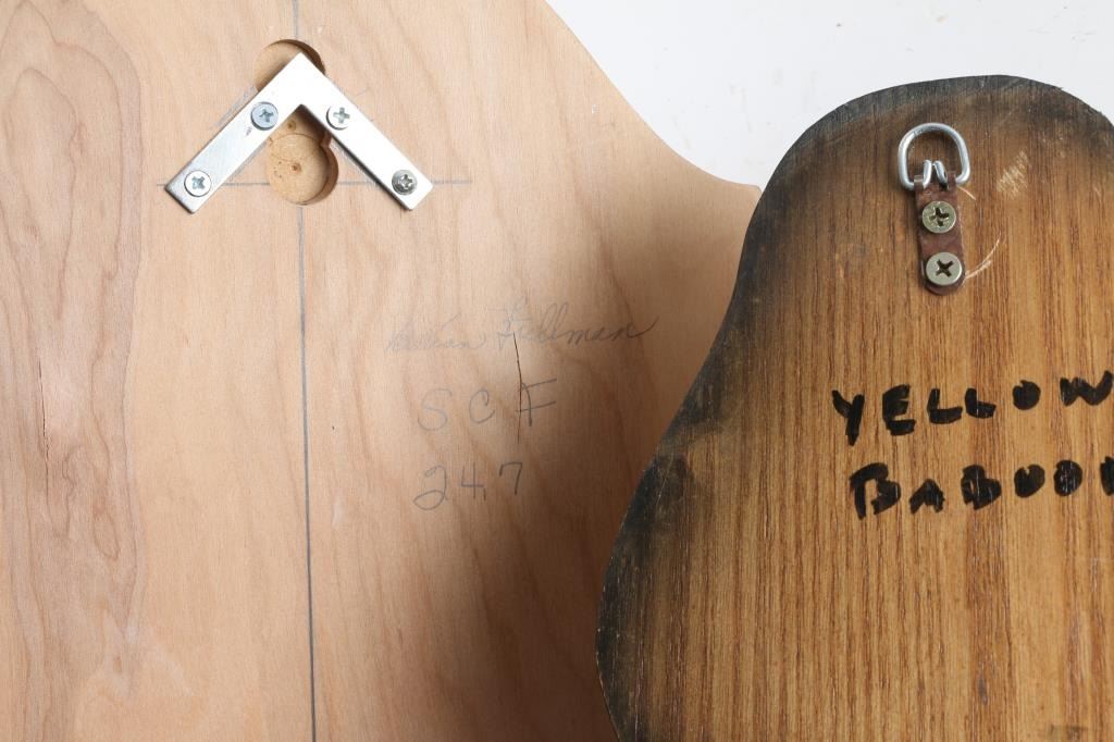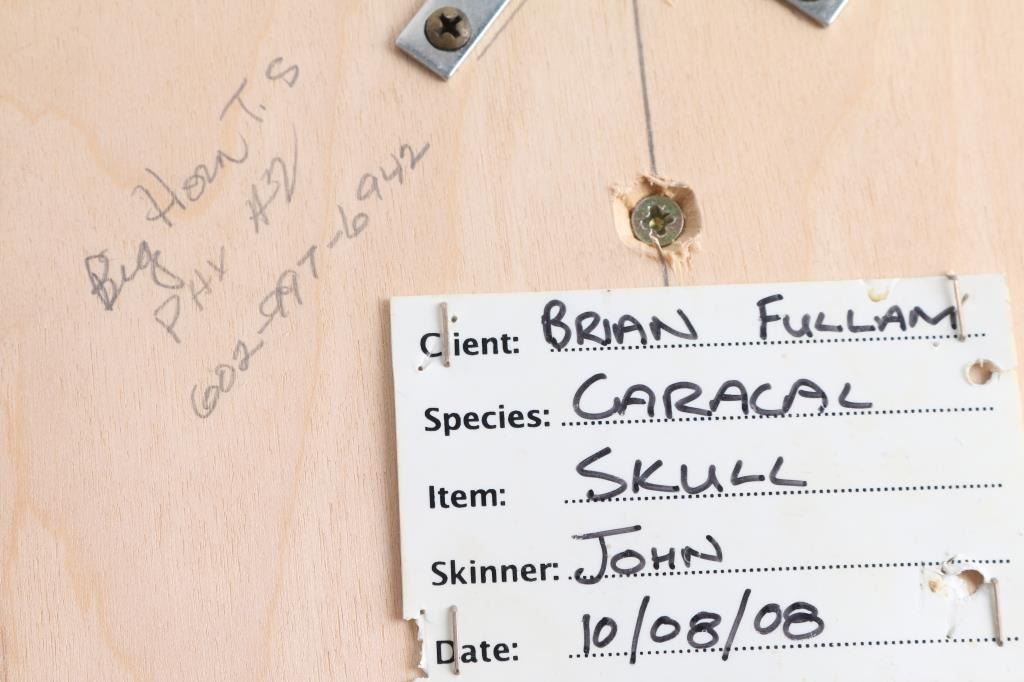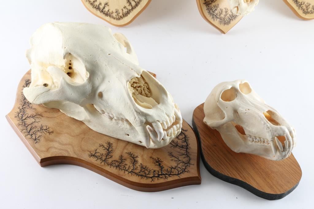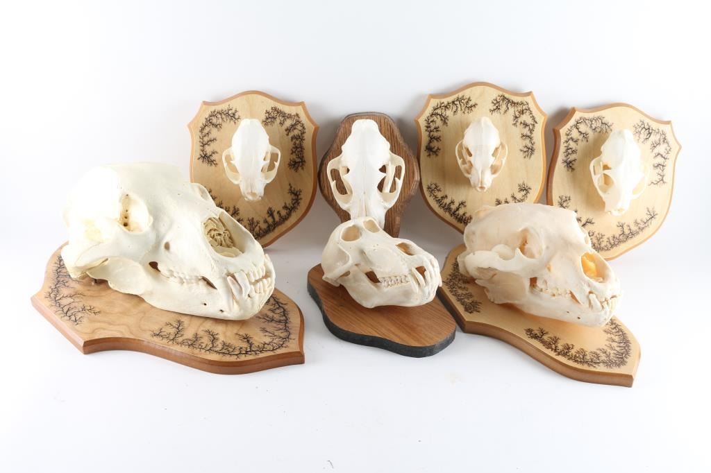 Mounted on wood boards. Includes lynx, mountain lion, Caracal, yellow baboon, bobcat, brown bear, unknown bear.