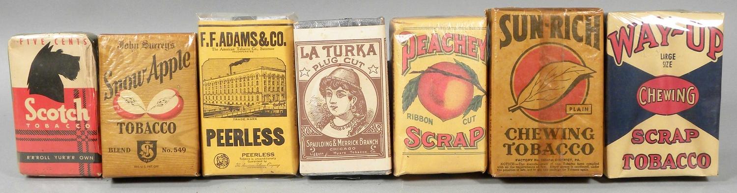 Lot of Seven Tobacco Packs including Scotch, Peerless, Sun-Rich, Snow Apple, Peachey and Wa-Up. Very good to excellent condition. Pack sizes vary. Start Price $40