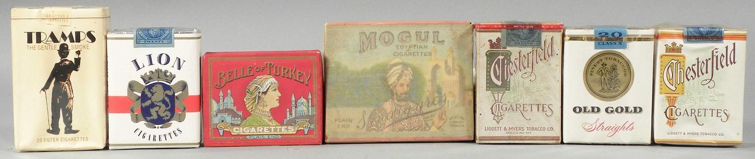 Lot of Seven Cigarette Packs including Lion, Tramps, Mogul, (2) Chesterfield, Old Gold and Belle of Turkey. Lion and Belle of Turkey not in original wrapper. All in very good to excellent condition. Pack sizes vary. Start Price $40