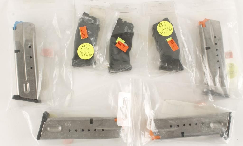 Four Smith & Wesson High-Cap pistol mags (9mm and 40S&W) and three CZ 452 rifle mags in .22LR.