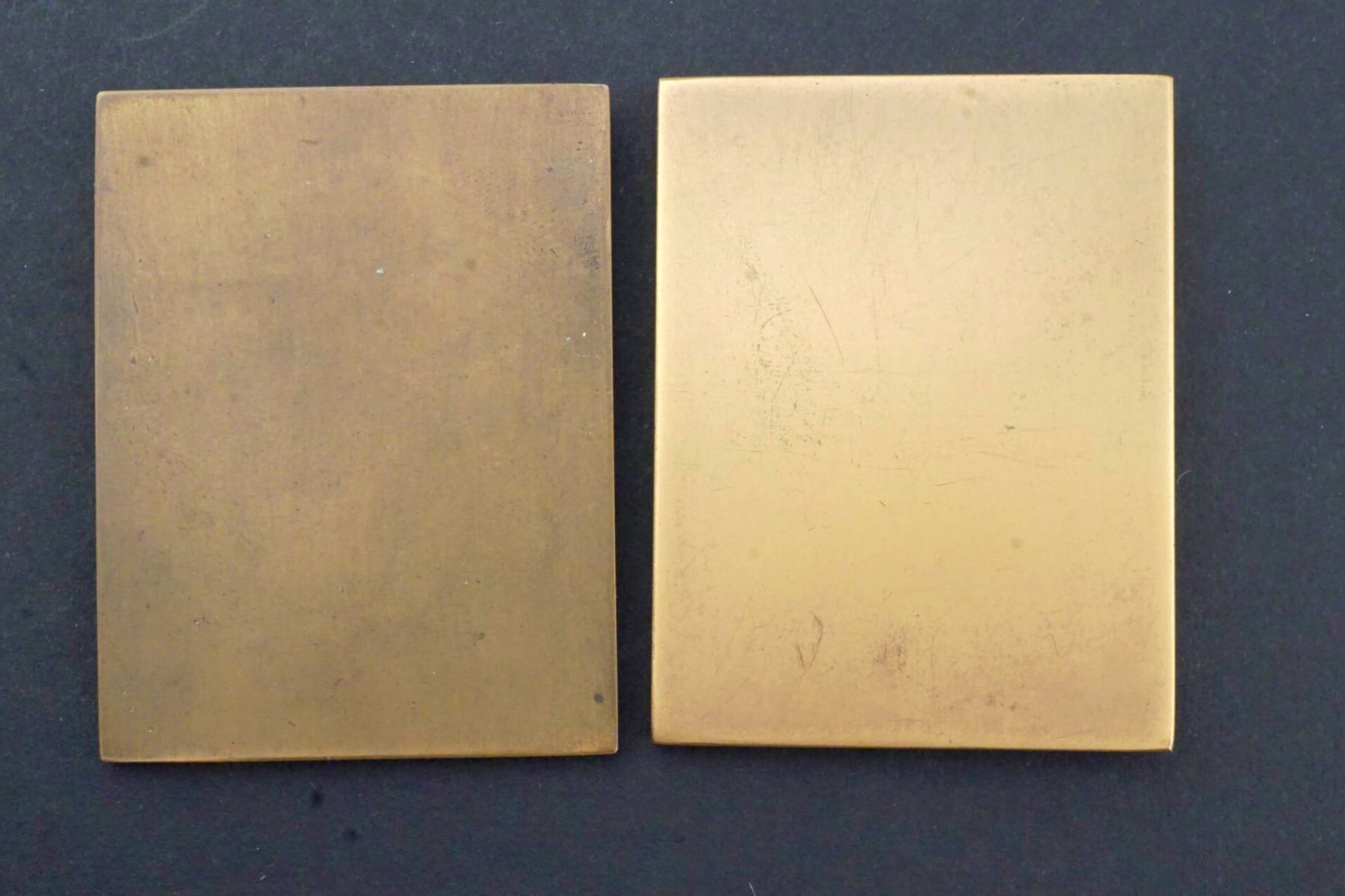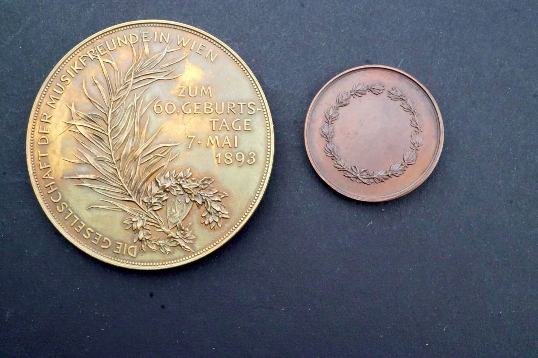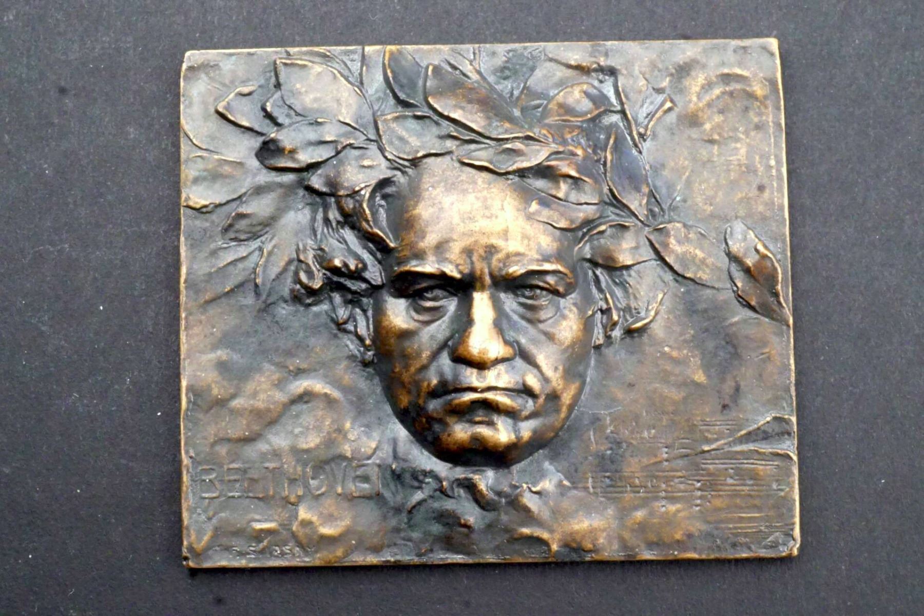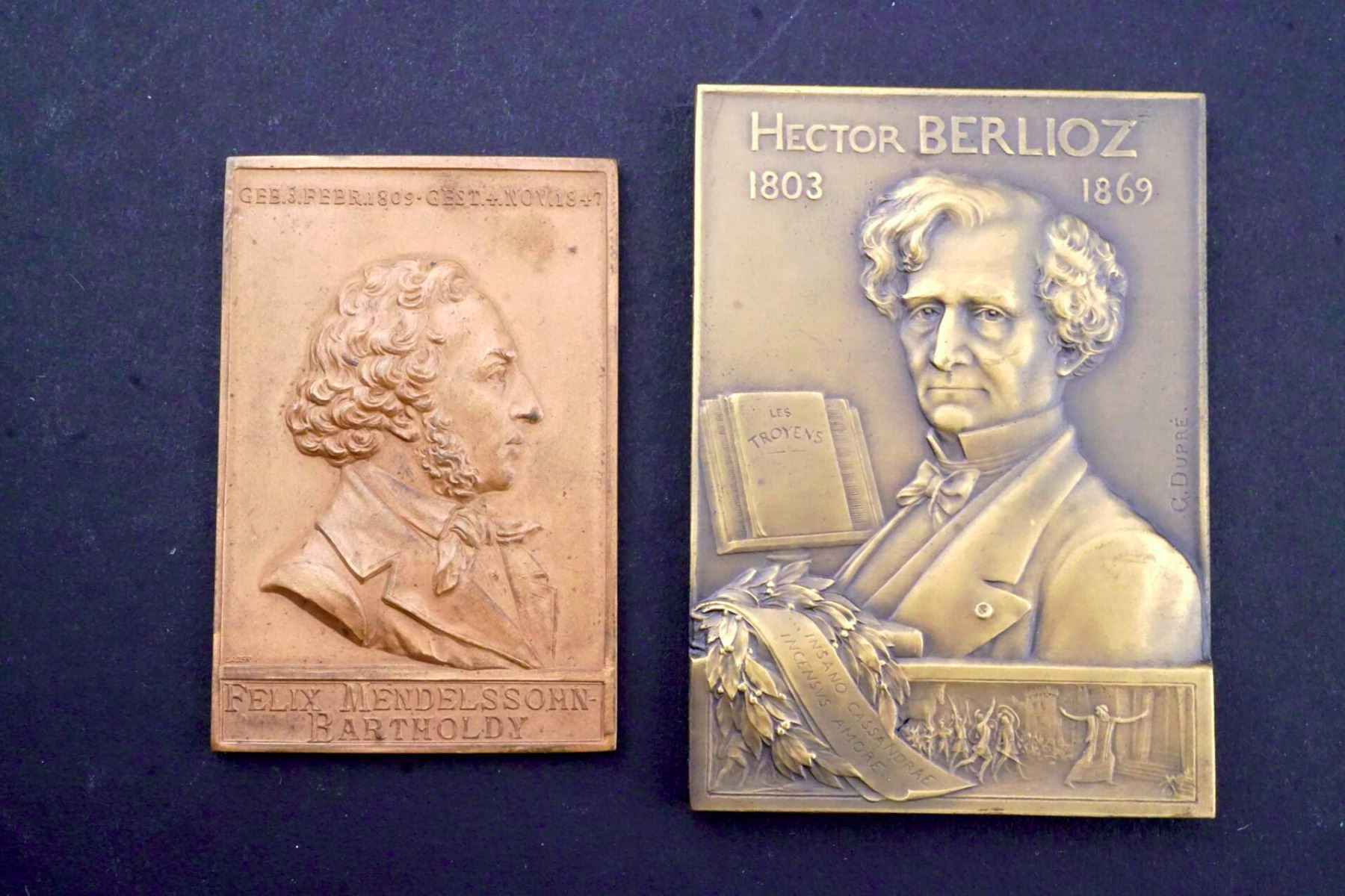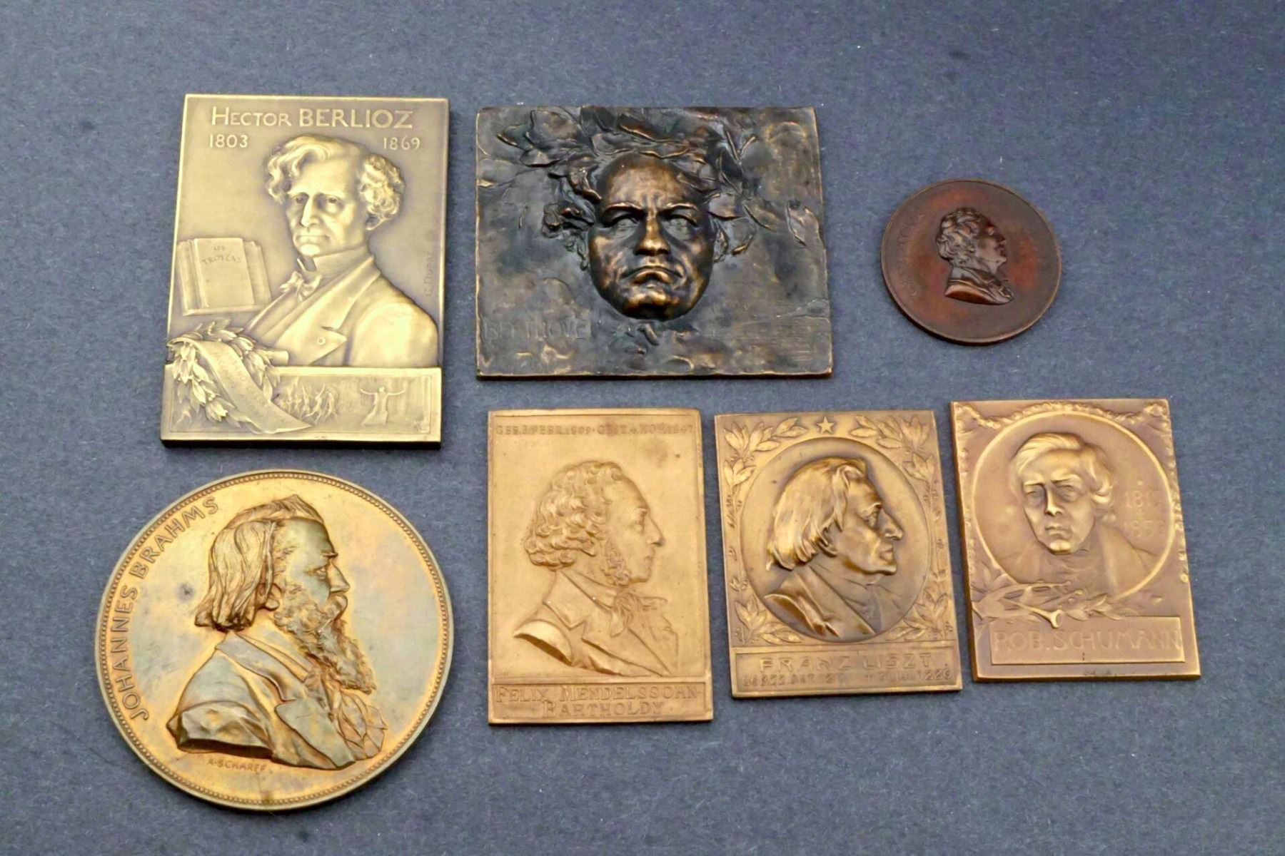 1) Plaque to Hector Berlioz, signed G. Dupré Beautiful piece. 48 x 67 mm. 2) Plaque with high relief repoussé facing head of Beethoven 53 x 63 mm. 3) Johannes Brahms portrait, right. Rev: 60th anniversary of the Vienna Society of Music Lovers, 1893, 58 mm, 4) CHRISTOPH. GLUCK Bust, right. Reverse: Wreath Paris mint CUIVRE mark on edge 32 mm. 5) Uniface plaque, portrait, right, of Felix Mendelssohn Bartholdy 37 x 54 mm. 6 & 7) Uniface portrait plaques, both 38 x 50 mm, of ROB. SCHUMAN and FRANZ LISZT.