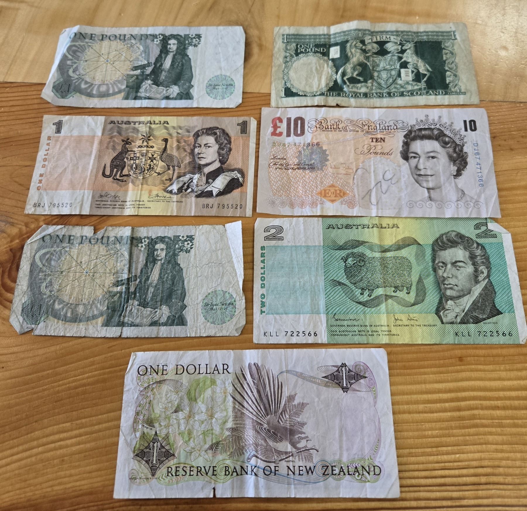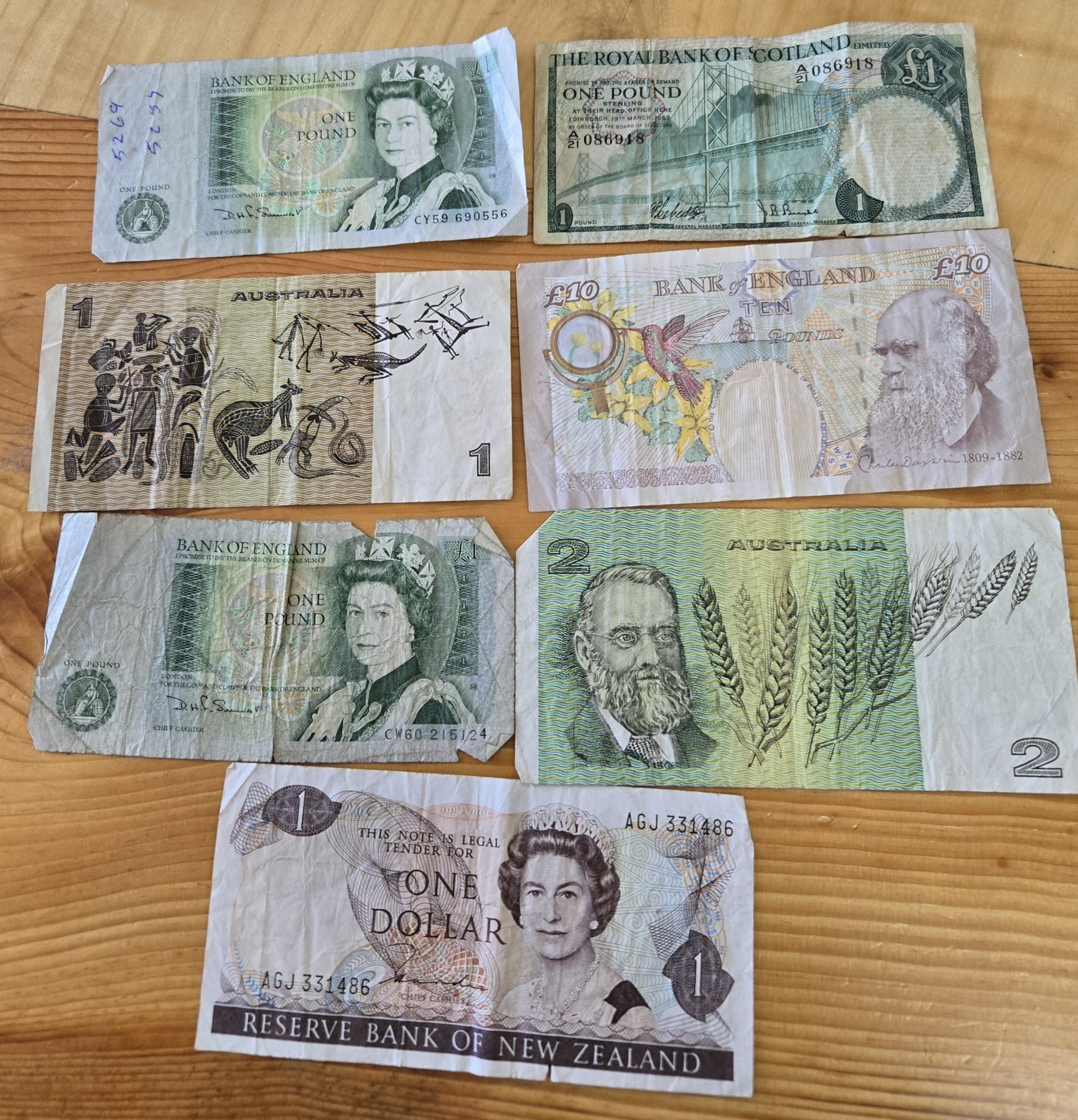 Lot of Seven Older British Commonwealth Banknotes includding three from England, one from Scotland, two from Australia, and one from New Zealand.