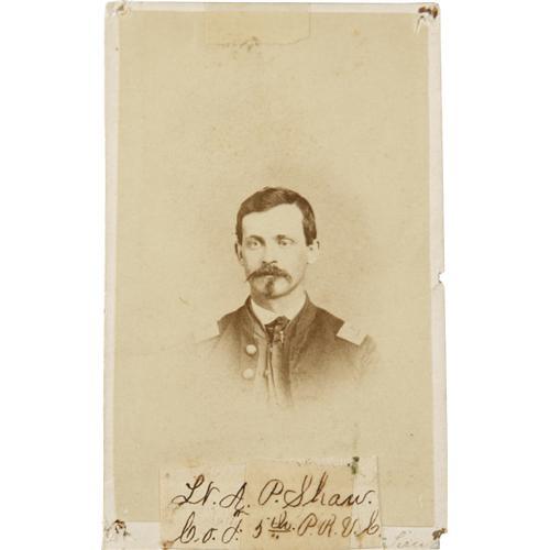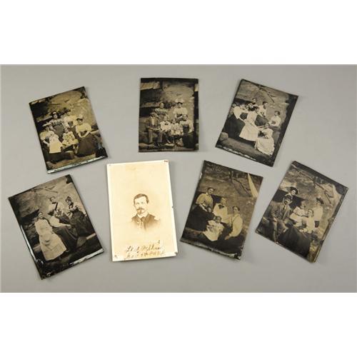 <B>Lot of Seven Photos of Lieutenant Percival Shaw and Family at Devils Den, Gettysburg,</B></I> Shaw and family, 6 tintypes, 2.5" x 3" and a <I>Carte de Visite</B></I> of Shaw in uniform, 2 3/8" x 3 7/8", by R. W. Addis. A. Percival Shaw enlisted on February 16, 1862 at Brandford County, Pennsylvania as a first lieutenant. He was an officer in Company "F" 34th Pennsylvania Infantry. He was discharged April 30, 1864 due to disability. The Devil's Den is a rocky expanse of shrubs and scrub trees, the southernmost part of Houck's Ridge, directly west of Little Round Top across the Plum Run Valley, known to the soldiers as the "Valley of Death". The tintypes show some wear and one has considerable rippling. The CDV has thumb-tack holes along the edge and an applied label with Shaw's name, rank, and unit. An interesting group.<BR><BR><b>Shipping:</b> Miscellaneous Collectibles, Smal (<a target="_blank" href="http://www.heritageauctions.com/common/shipping.php">view shipping information</a>)