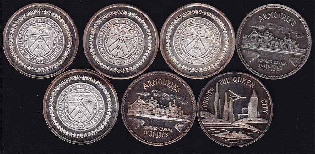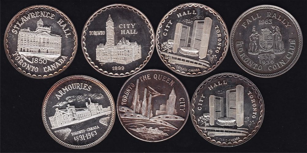 Lot of Seven Silver Toronto Medals - Including: St. Lawrence Hall 1953; Old City Hall 1953; City Hall 1953 (2 different); Coin Club 1963; Armouries 1963 (2 different). 7 Pcs.