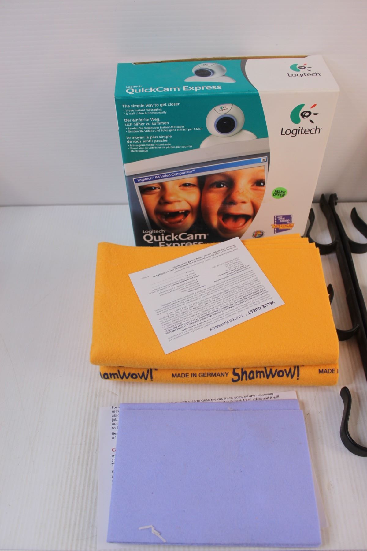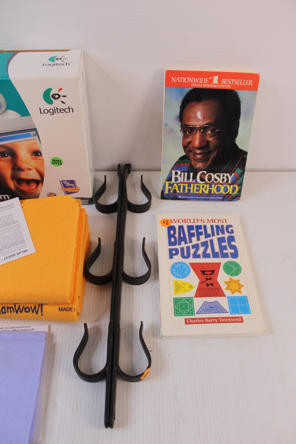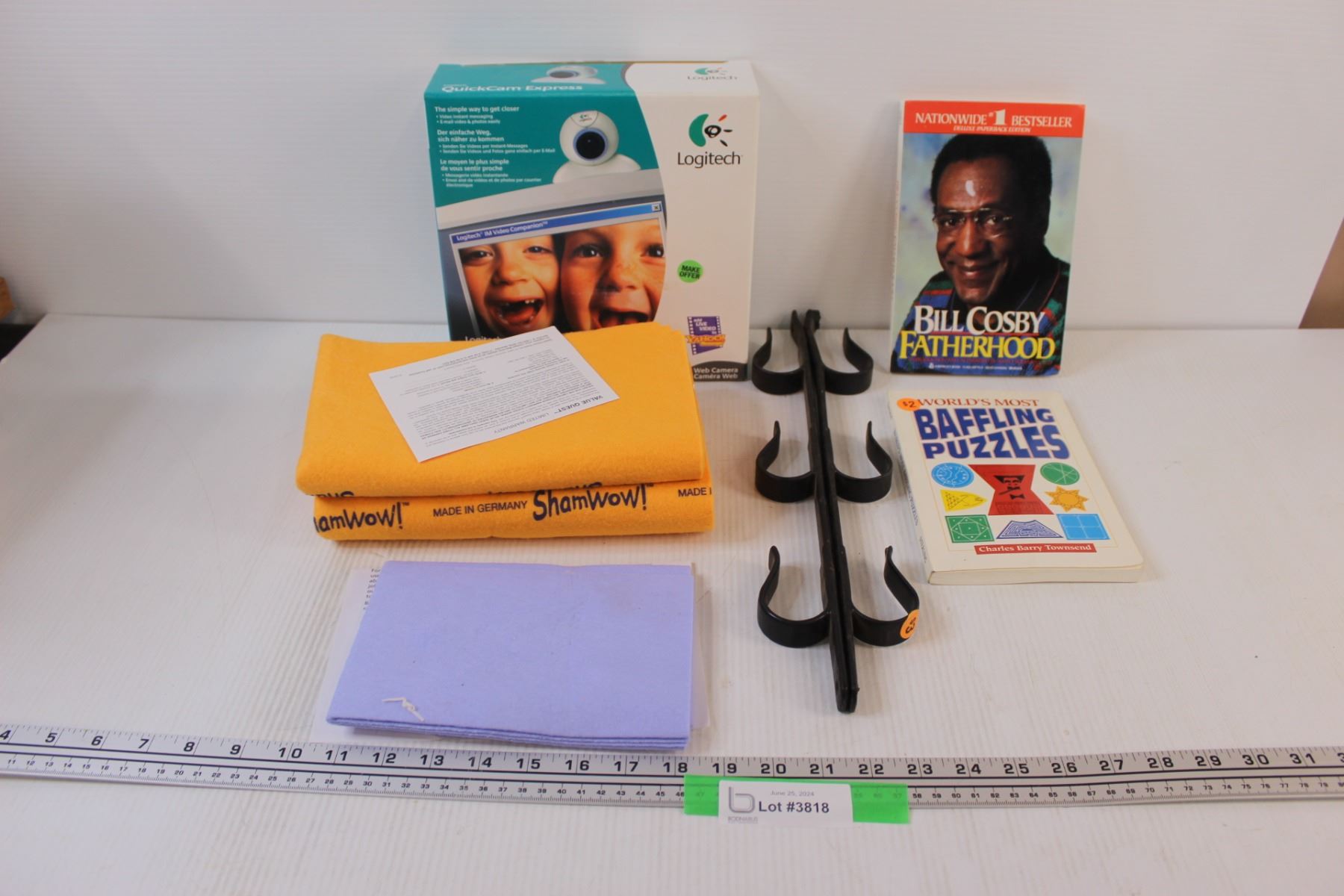 Lot of: ShamWow!, Metal Gun Rack, Quick Cam Set (As Is), Bill Cosby Book, Puzzles