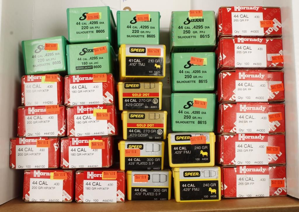 7 boxes Sierra 44 Cal., 1 box Speer 41 Cal., 6 boxes Speer 44 Cal., and 14 boxes Hornady 44 Cal. bullets.