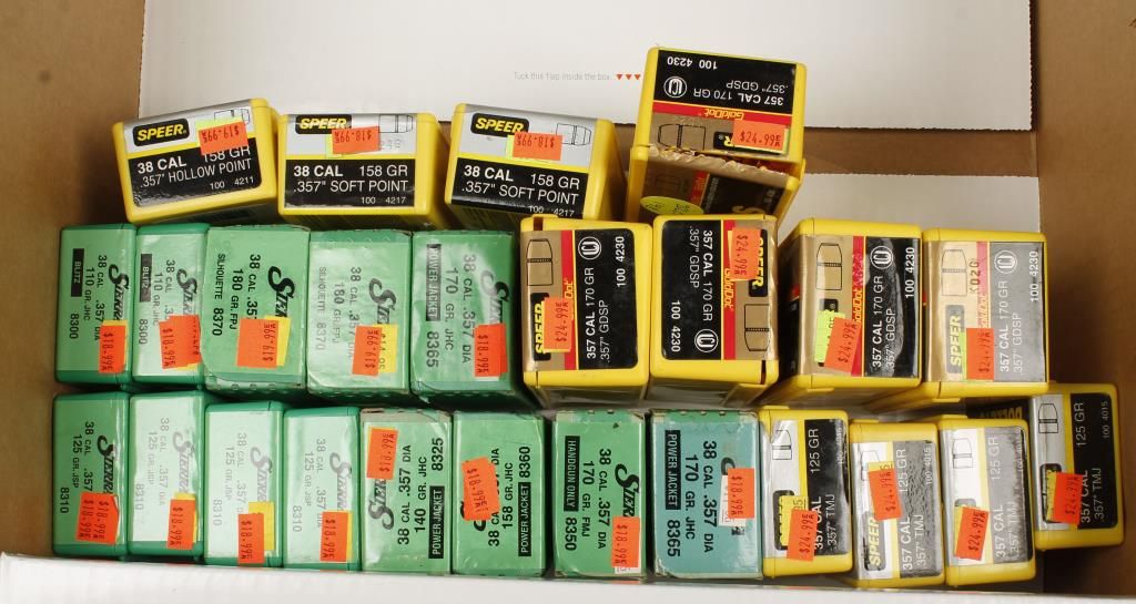 13 boxes Sierra 38 Cal., 3 boxes Speer 38 Cal., and 9 boxes Speer 357 Cal. bullets.