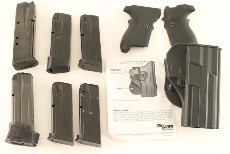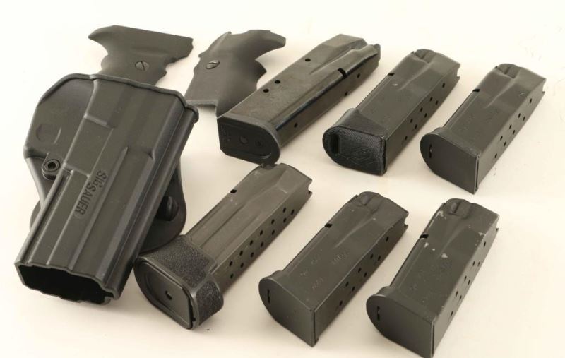 (4) p224 .40 mags All factory type, (1) 224 9mm (1) 226 .40cal, Pair of G10 Grips, and a Sig Holster for a 229 or 226.