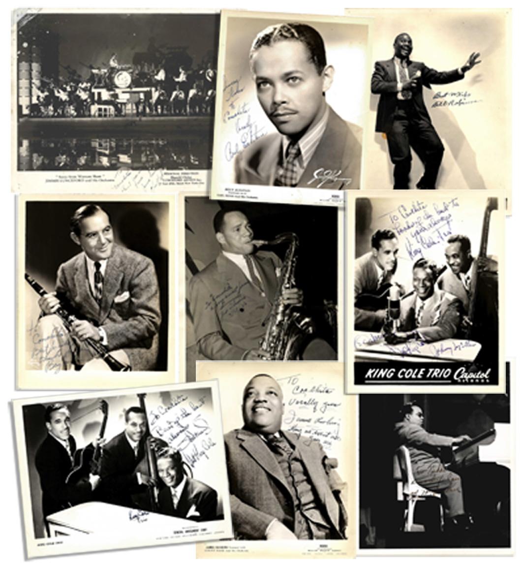 Lot of nine beautiful 8'' x 10'' black and white photos of celebrated jazz and big band personalities. Each photo is signed and inscribed as follows: (1) ''to Conchita / Best Wishes & thanks for all / Benny Goodman'', (2) ''To Conchita / Loads of the best to you always / King Cole Trio / Oscar Moore / Nat King Cole / Johnny Miller'', (3) ''To Conchita / Best wishes from Jimmie Lunceford / 4/28/38'', (4) ''To 'Conchita' / a very sweet person / Sincerely / Joe Thomas / 4/17/42'', (5) ''To Conchita / vocally yours / James Rushing / Stay as sweet as you are'', (6) ''Best Wishes / Bill Robinson'', (7) ''To Conchita / Best of the best always / Sincerely / Nat King Cole / King Cole Trio'', (8) ''To Nikki / a wonderful person / Milt Buckner'', (9) ''Sincere Wishes to Conchita / Vocally / Billy Eckstein''. Several of the photos have some creasing and thumbtack holes at corners. All photos are glossy except for the Bill Robinson which is matte. Very good overall.