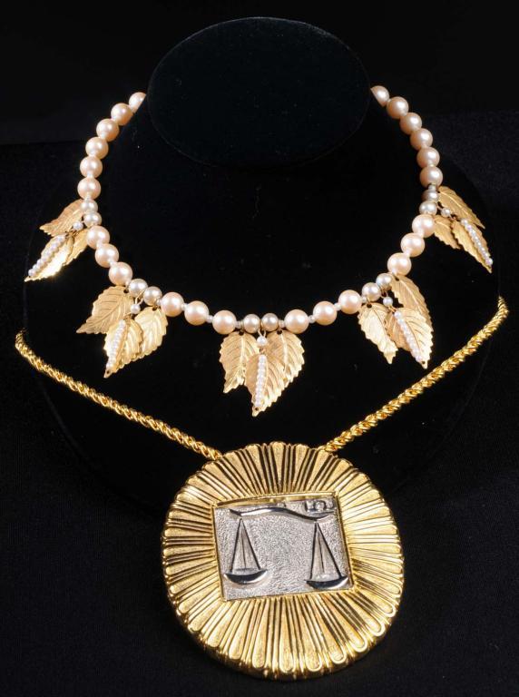 Description Haskell leaf and faux pearls necklace with Judith Leiber chain and pendant pin. Condition (Excellent). Size Largest: 20" L.