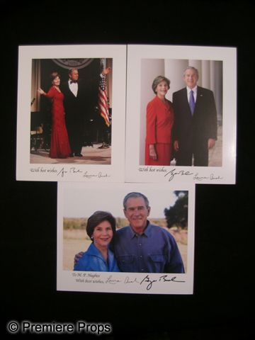 A lot of (3) glossy color photos depicting former President George W. Bush and his wife Laura. One photo features George and Laura Bush dressed in casual clothes, possibly taken on their ranch, and is signed by both of them, with 'To M. Hughes with Best Wishes' printed in black ink. The other two photos feature signatures of George and Laura Bush with 'With best wishes,' printed in ink on lower front. (measures approx. 8"x 10" ea.)