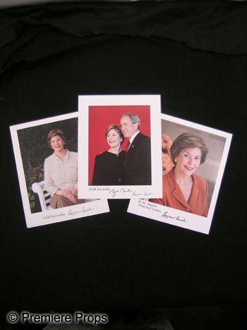For collectors of political history, this is a lot of (3) glossy color photos depicting former President George W. Bush and his wife Laura. One photo features George and Laura Bush, and is signed by both of them. The other two photos feature signatures of former first lady Laura Bush, with 'To M. Hughes with Best Wishes,' and 'with best wishes,' printed on lower front. (measures approx. 8"x 10" ea.)