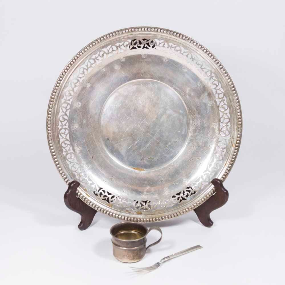Including Wallace sterling silver plate, 12" D; pickle fork - Heirloom "silver rose"; and child's cup. Approx. 17 ozt. (6054)