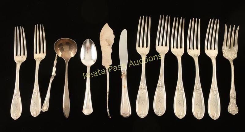 Including 7 forks marked 'WWH', fork marked 'TE' and 'XXS', a Gorham pick, and more.