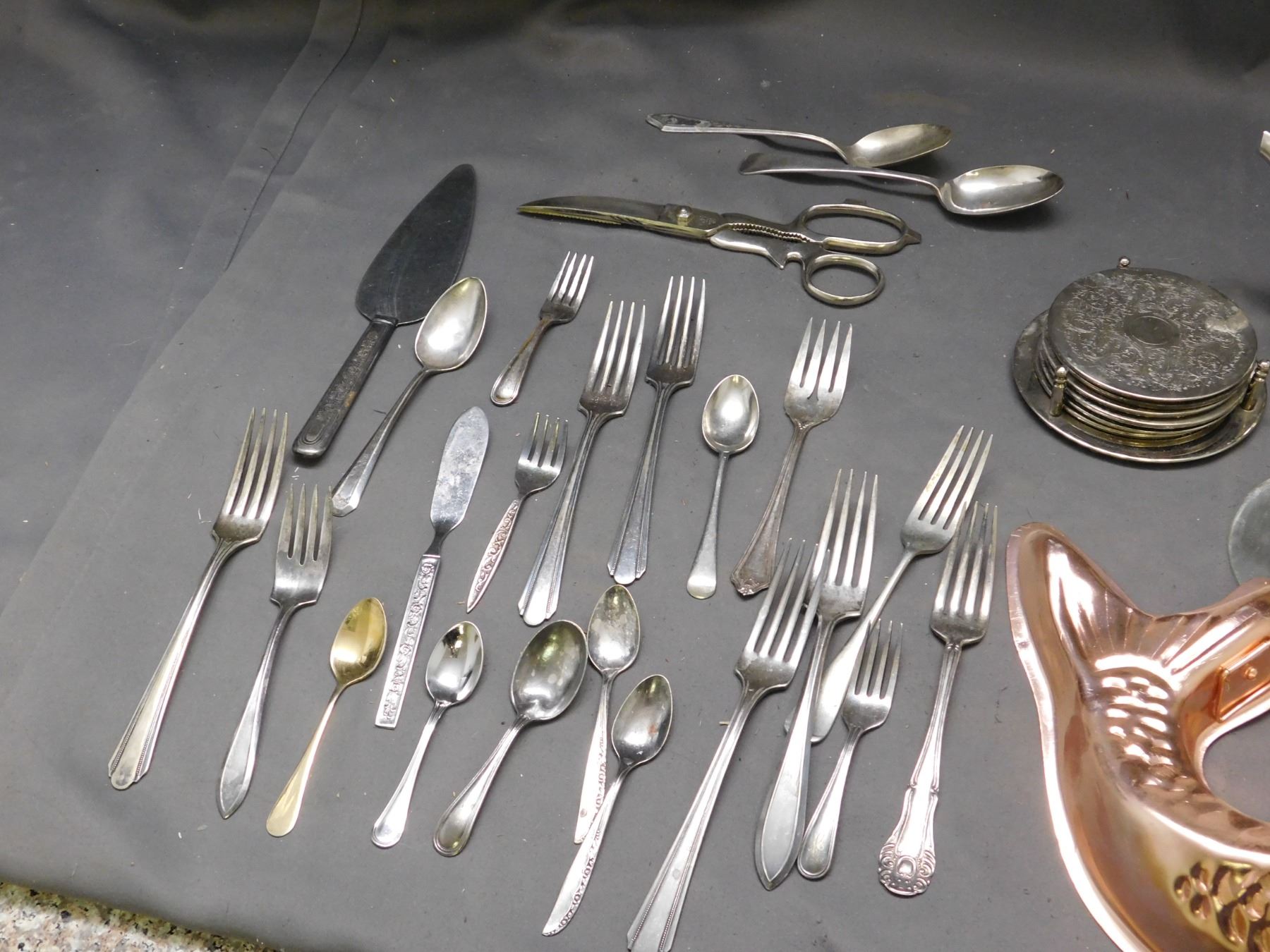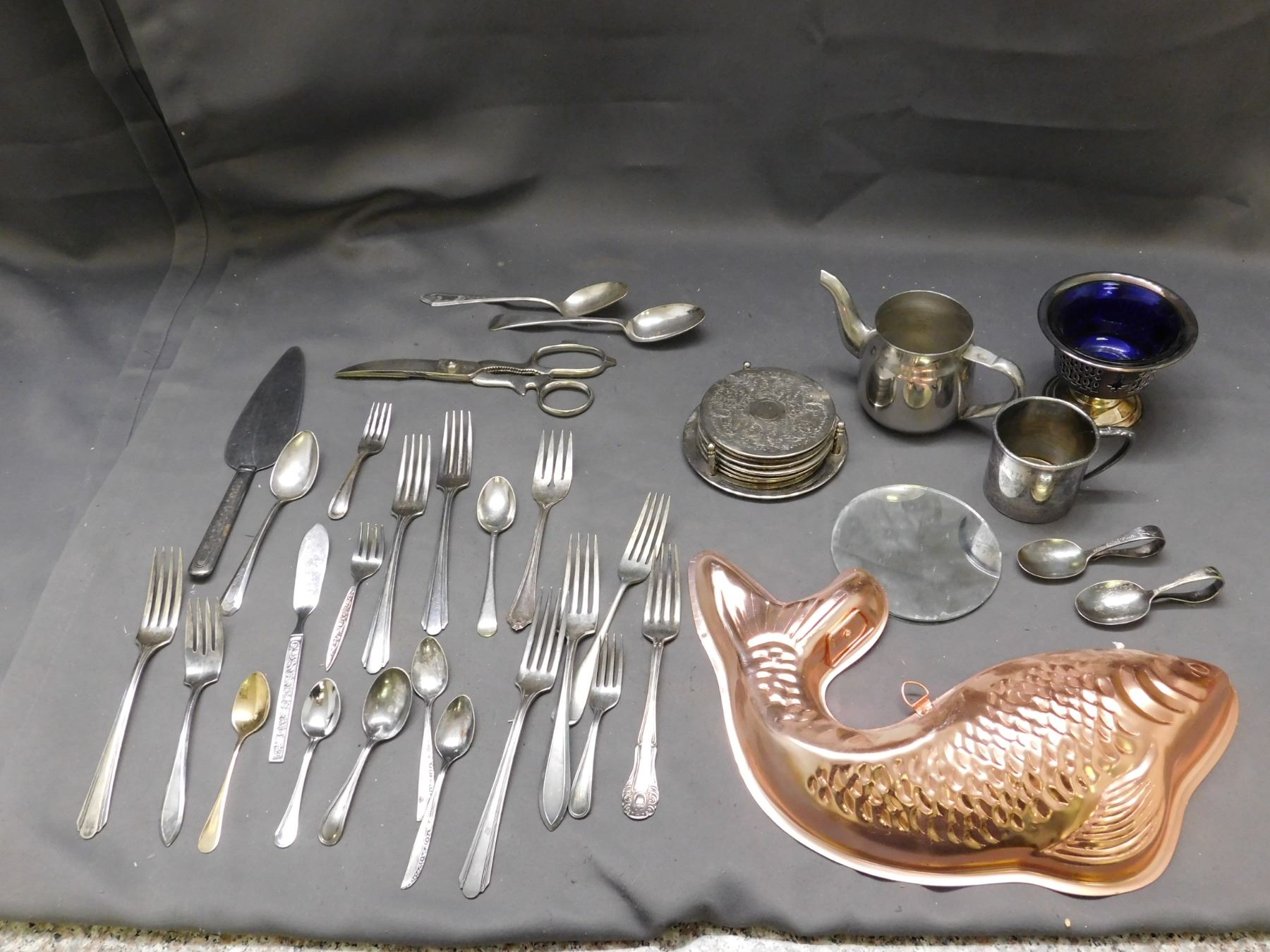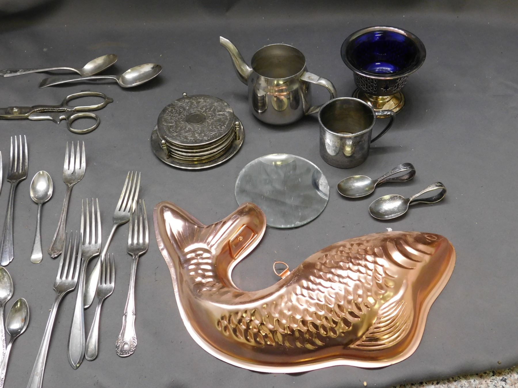 Lot of Silverplate Coasters, Silverware, Childrens ABC Alphabet Mug, Tea Spoons, Cobalt Dish, Fish