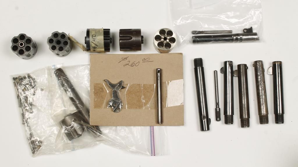 6 Cylinders, 6 single action army barrels (4 Colt, 1 Gary Reeder and one unmarked). A Colt 1911 barrel. 2 SAA cylinder pins. A bag of grip screws and escutcheons. A hammer and ejector rod housing.