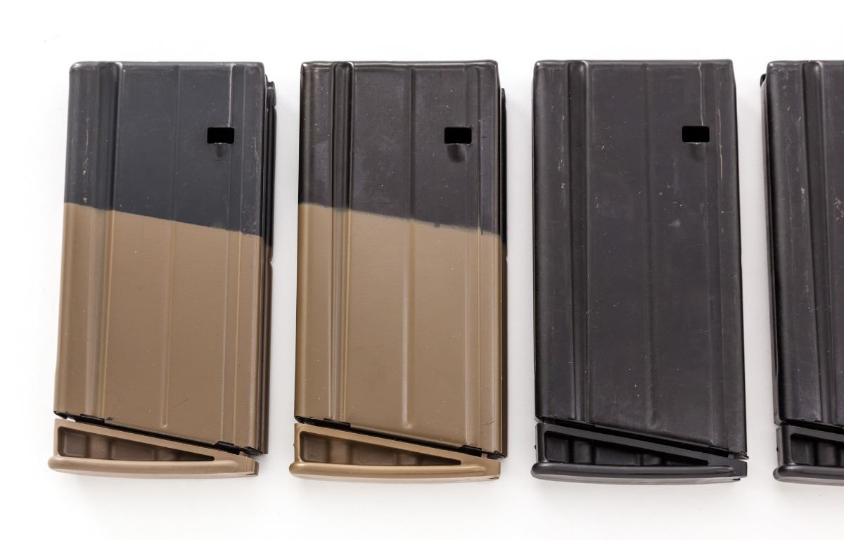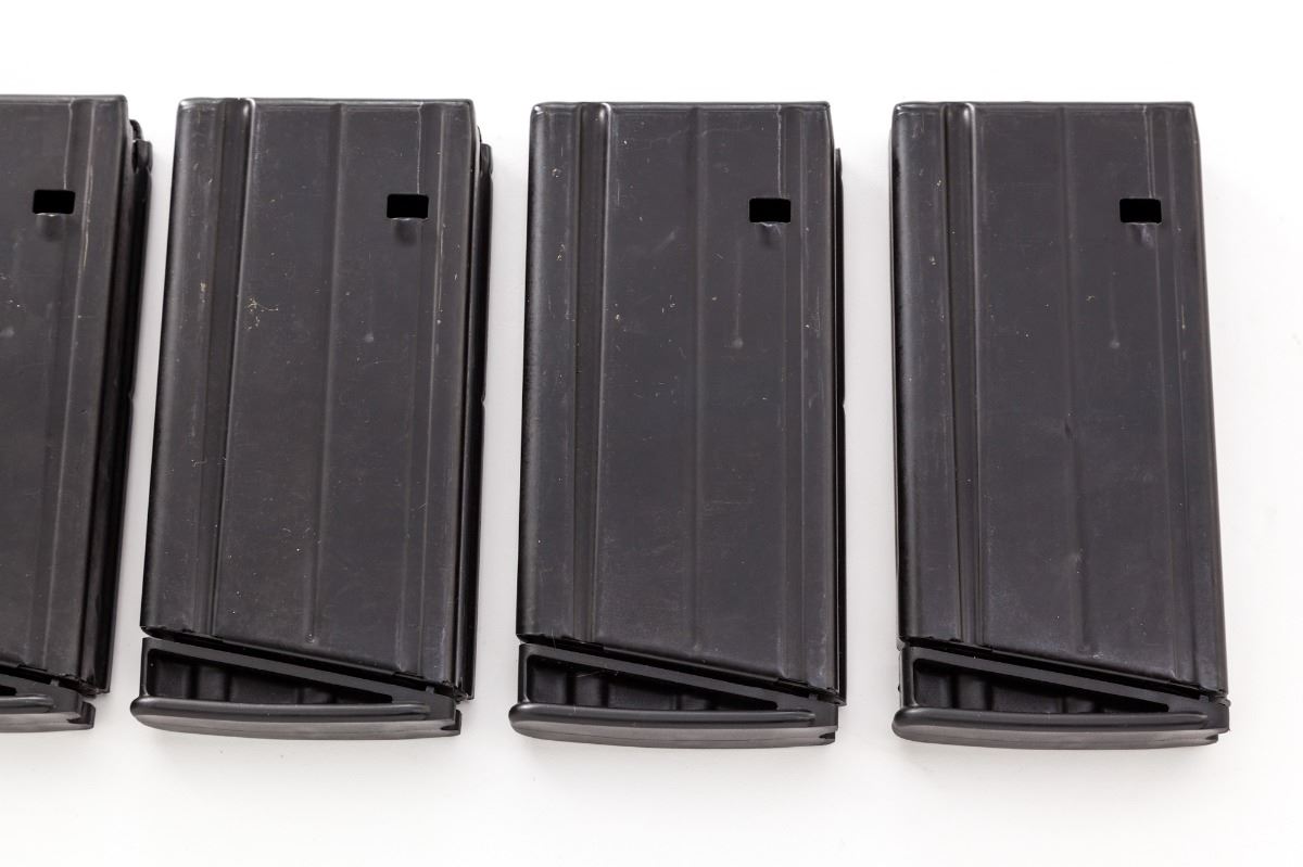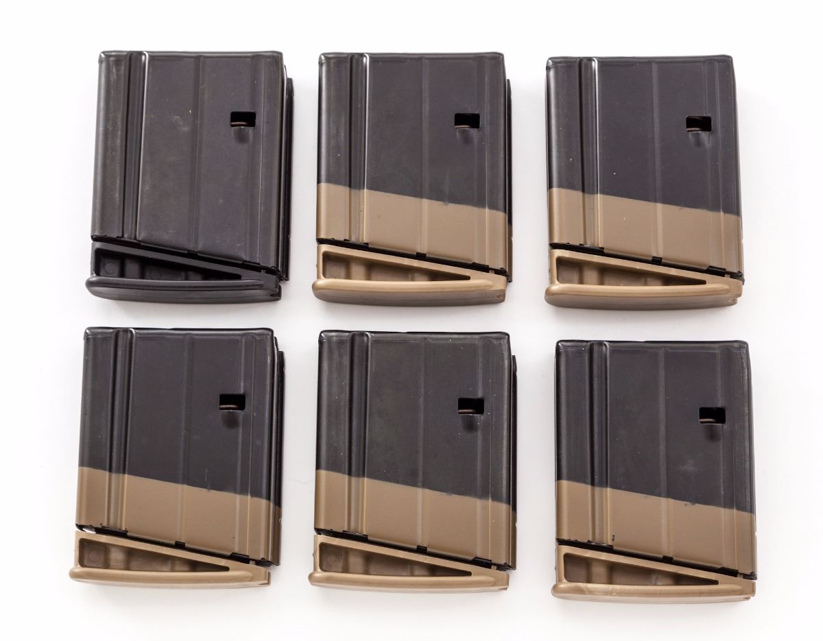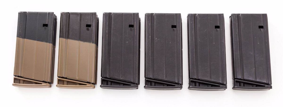 Lot of Six (6) FN SCAR 17S High-Capacity Magazines, 20-round capacity, four are all black, two are two-tone black and dark earth finish. Condition to all is excellent showing only light use. Est.: $150-$250/lot. (High cap mags not available to Calif. residents.)