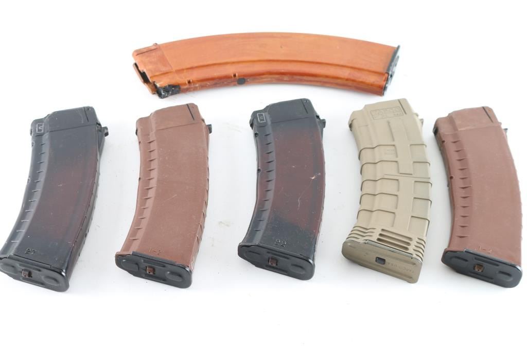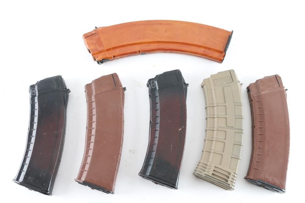 includes an orange bakelite 45 rd for RPK74, two plum Izhmash 30 rd mags, two "circle 21" Bulgarian brown polymer mags, and a Tapco 30 rd FDE mag.