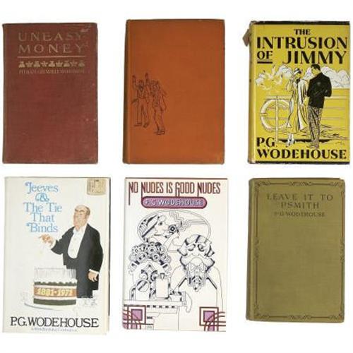 <B>Lot of Six P. G. Wodehouse Books.</B></I> A fine selection of works from the master English storyteller including: <B><I>The Intrusion of Jimmy</B></I></B></I>. New York: Grosset & Dunlap, 1910. Early reprint. Twelvemo. 314 pages. Original red cloth with titles in black on the spine and front board. A sound copy in a clipped dust jacket, missing a moderately large size chunk from the head of the spine, else very good; <B><I>Uneasy Money</B></I></B></I>. New York: D. Appleton and Company, 1916. First edition. Twelvemo. 326 pages. Original red cloth with titles stamped in gilt on the spine and front board. Binding shaken with significant shelf wear and soiling to the boards. Contents slightly toned. Contemporary owner's signature on the front pastedown. Good condition; <B><I>Leave it to Psmith</B></I></B></I>. New York: A. L. Burt, 1924. Twelvemo. 347 pages. Early reissue. Original green cloth with titles and decoration in black on the spine and front board. Moderate wear at the head and foot of the spine. General shelf wear to the boards. Contents toned but sound. Very good; <B><I>Laughing Gas</B></I></B></I>. Garden City: Doubleday, Doran & Company, Inc., 1936. First edition. Twelvemo. 303 pages. Original orange cloth with titles and decoration in black on the spine and front board. Spine soiled and darkened with moderate shelf wear to the extremities of the boards. Corners bumped. Contents toned, especially at the preliminary pages with book shop ink stamp on the back pastedown. Good; <B><I>No Nudes is Good Nudes</B></I></B></I>. New York: Simon and Schuster, 1970. First edition. Octavo. 220 pages. Orange paper over boards and maroon cloth back strip with titles in black on the spine. A handsome copy in dust jacket. Very good; and <B><I>Jeeves and the Tie That Binds</B></I></B></I>. New York: Simon and Schuster, 1971. First edition. Octavo. 189 pages. Original yellow cloth with black spine titles. A nice copy in dust jacket (old price sticker on front panel) in very good condition.<BR><BR><BR><b>Shipping:</b> Books & Catalogs (<a target="_blank" href="http://www.heritageauctions.com/common/shipping.php">view shipping information</a>)