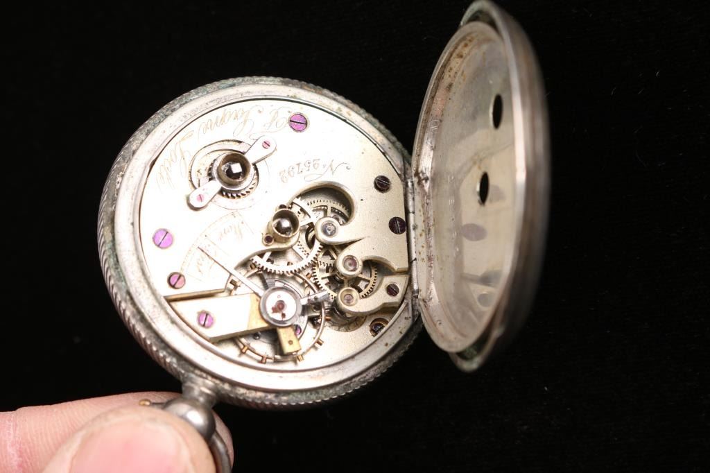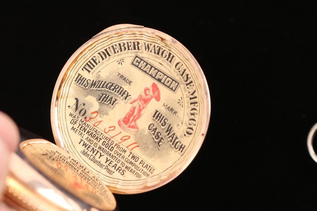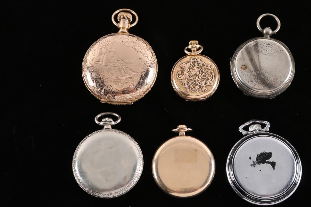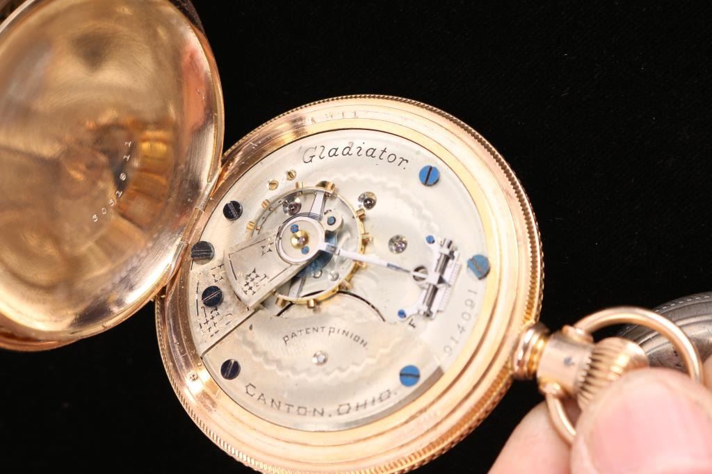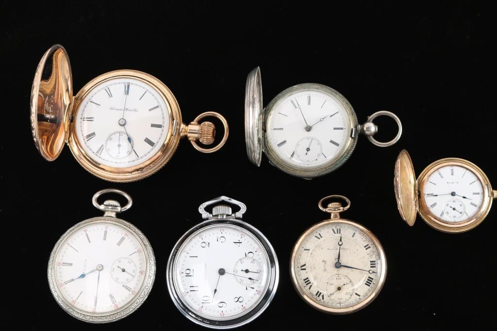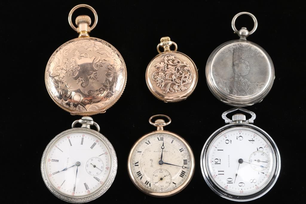 The following six watches are not running, in need of repair. 1) Waltham grade 620, model 1899, 16 size, 15 jewel. Number 12806232, manufactured 1903. Illinois Spartan base metal case. Good balance. 2) South Bend grade 4067, model 1, 12 size, 15 jewel. Good balance. 3)1870-1880 silver pocket watch, signed F. Sagne, Locle, key wind. The silver is not marked, but I believe it is sterling. This is a Swiss watch with hinged inner back and front cover. The case is engraved on both sides, but shows some wear compatible with age. Movement number25792. Not running, good balance. 4) Hampden Gladiator, model 2, 18 size, 11 jewel. Number 914019, manufactured 1895. Dueber hunter 10K gold filled 20 year case. Has the rare paper label with the red image of a gladiator. Case is etched with floral motifs on one side and a image of workmen pushing logs in the river to a mill, we could find no reference to this, very nice. Good balance. 5) Elgin grade 290 model 6, 16 size, 7 jewel, ruby. Number 14342199, manufactured 1910. Keystone silveroid case. Not running, good balance. 6) Elgin grade 318 model 2, 0 size, 15 jewel. No crystal, not running, good balance. Gold filled 25 year hunter case with floral motifs.