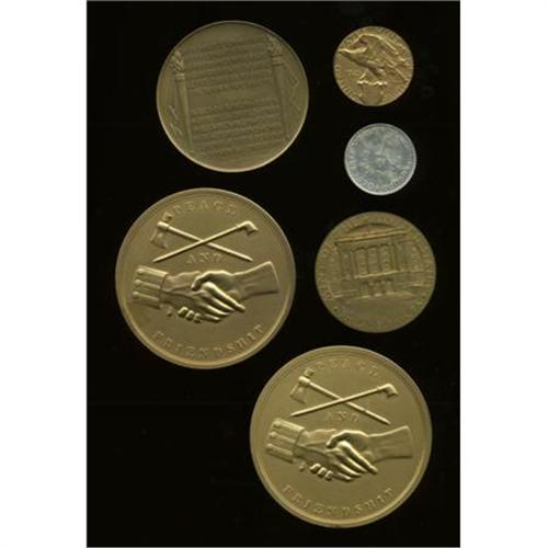 <B>Lot of Six Presidential Medals.</B></I> Contains: large <B>George Washington Indian Peace medal</B></I> (modern); large <B>John Adams Indian Peace medal</B></I> (modern); large <B>Lincoln/Eisenhower 1954 medal</B></I> commemorating the 100th anniversary of the Republican party; a small <B>1923 Warren G. Harding medal;</B></I> a <B>1732-1932 George Washington birth medal;</B></I> and a <B>small silver coinlike item</B></I> that promotes a world currency. All bronze except for the silver Eisenhower piece.<BR><BR><b>Shipping:</b> Coins & Currency (<a target="_blank" href="http://www.heritageauctions.com/common/shipping.php">view shipping information</a>)