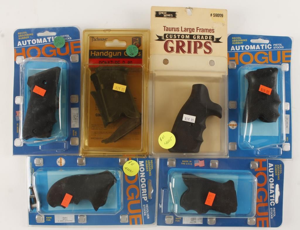 One Pachmayr, one Uncle Mike's and four Hogue. Fit various pistols and revolvers.
