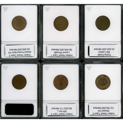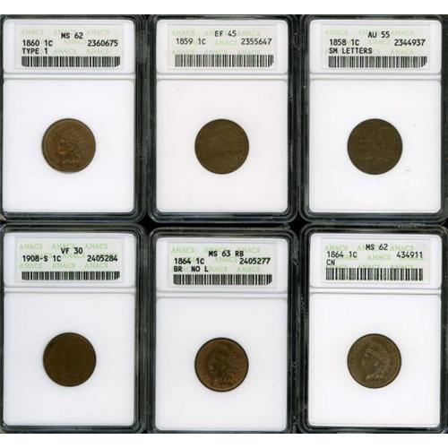 <b>Lot of Six Small Cents.</b> Includes: 1858 Flying Eagle Small Letters ANACS AU55; 1859 Indian ANACS EF45; 1860 1C Type I ANACS MS62; 1864 1C Copper-Nickel ANACS MS62; 1864 1C Bronze No L ANACS MS63 RB; and 1908-S 1C ANACS VF30. Lot of 6 coins.