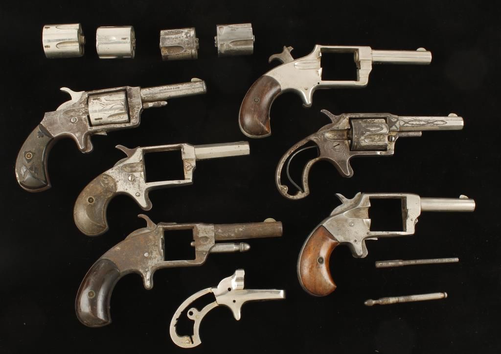 One lot of single action spur trigger rimfire revolvers for parts. First is a Hartford Arms which has no side plate and no spring for the cylinder bolt. Next is a "Red Jacket No 3" which has no grips, has a Victorian era Canadian Dime for a side plate. It has a cylinder that doesn't advance when cocked and the hammer doesn't stay cocked. Next is the frame and internals of a Lee Arms "Red Jacket No 3". There is no cylinder, hand or cylinder pin. Next is a Hopkins&Allen frame with grips, trigger and hammer. Then we offer a Smith's Patent frame with the hammer, trigger, hand, grips, cylinder pin and some other internal parts but no side plate. The last revolver frame is from a Defender 89 and seems to have everything but the cylinder and cylinder pin. The last frame is from a side swing derringer single shot and it is the frame only. Included are 4 5-shot cylinders and 2 cylinder pins. These cylinders may or may not be for the frames in this lot. Overall condition for all is incomplete/poor. *Antique Firearms*