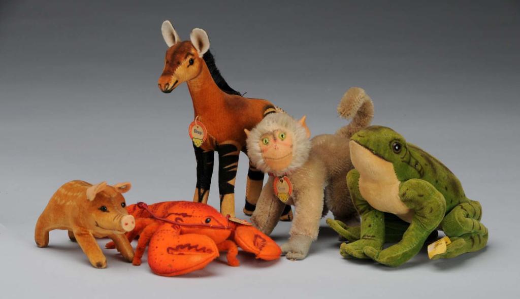 German. Includes Steiff Okapi painted felt with label, Steiff felt pig with glass eyes and button, Steiff Crabby #2017.00 with label, button and tag, Steiff Coco with label and Steiff Froggy #2370/10 with button and tag. Condition (Very Good - Excellent). Size Largest: 7" T.