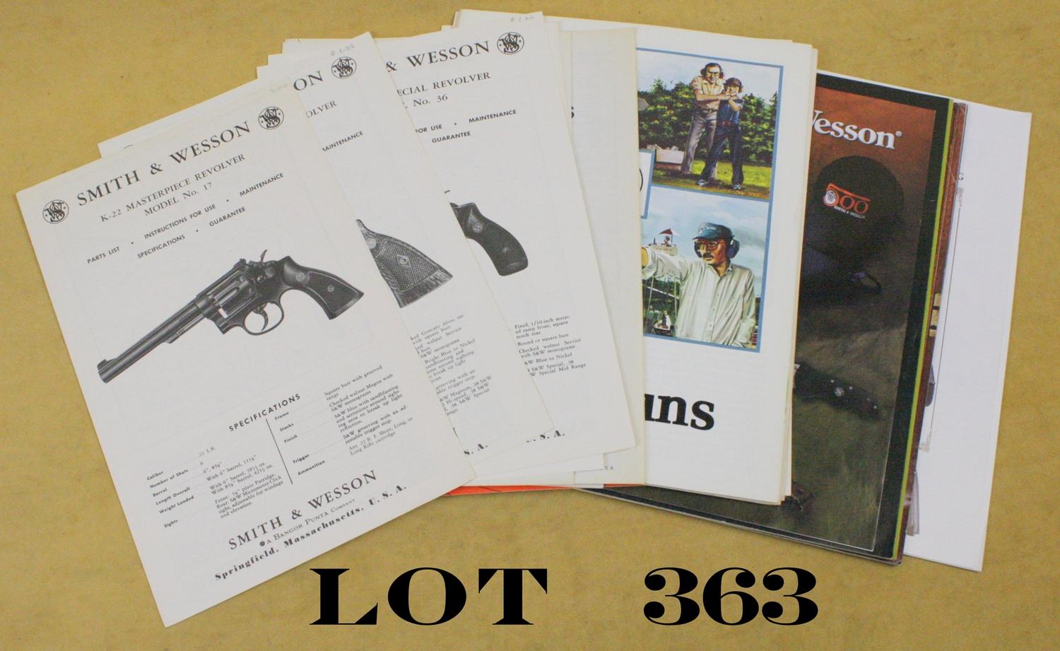 Lot of Smith and Wesson factory catalogs, a 1977 Colt Firearms Parts Price List booklet; a 1975 Smith & Wesson retail price list; and five original Smith & Wesson instruction sheets for a Model 36, a Model 19, a Model 17 K-22 Masterpiece; a Model 40 Centennial and a combination sheet on the Model 34/35 Kit Gun and Target Gun. Est.: $50-$75.