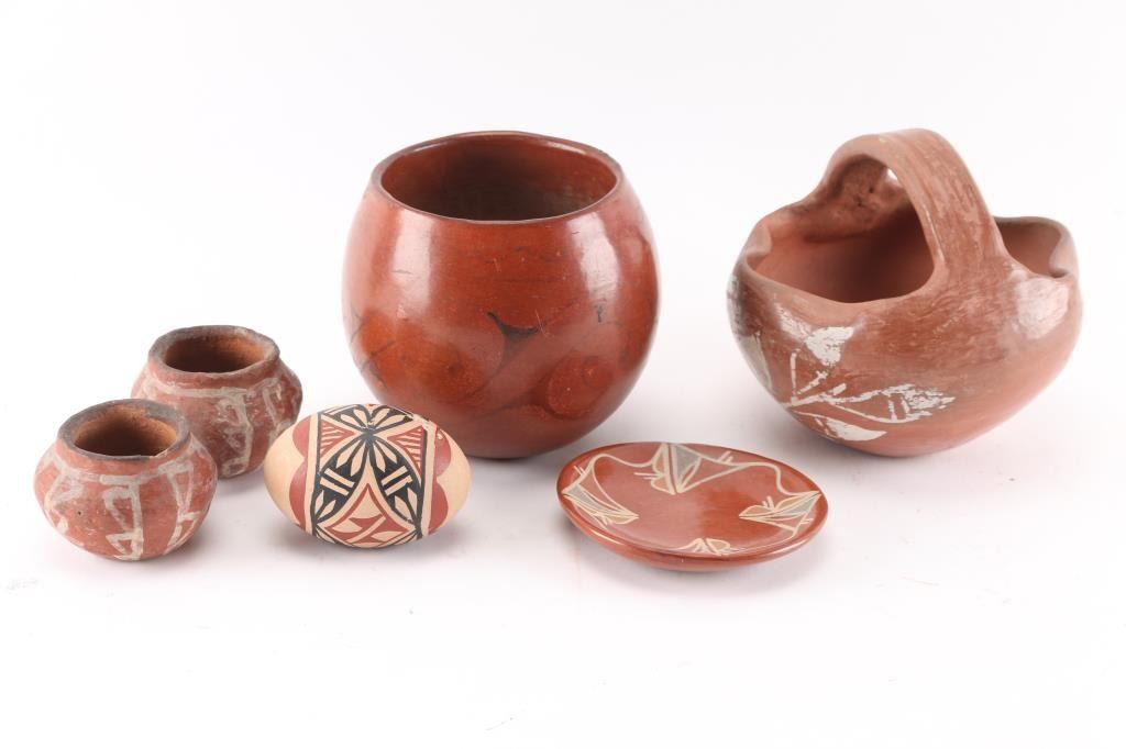 Maricopa pot with faded black painted design. Measures 4 3/4" by 4" around. Red handled pot with white paint. Measures 5" tall by 6" around. Small double connected pots measuring 5 1/2" across and 2" deep, 2 1/4" tall. A small redware plate from Mesa Verde in 1961, measuring 4 1/2" around. A painted egg shape measuring 3 1/3" long and about 2" wide.
