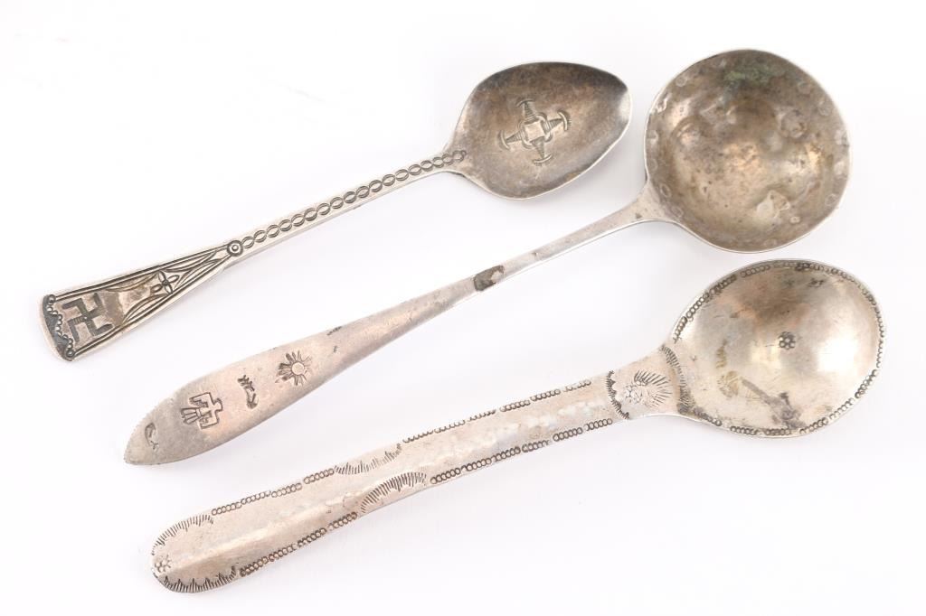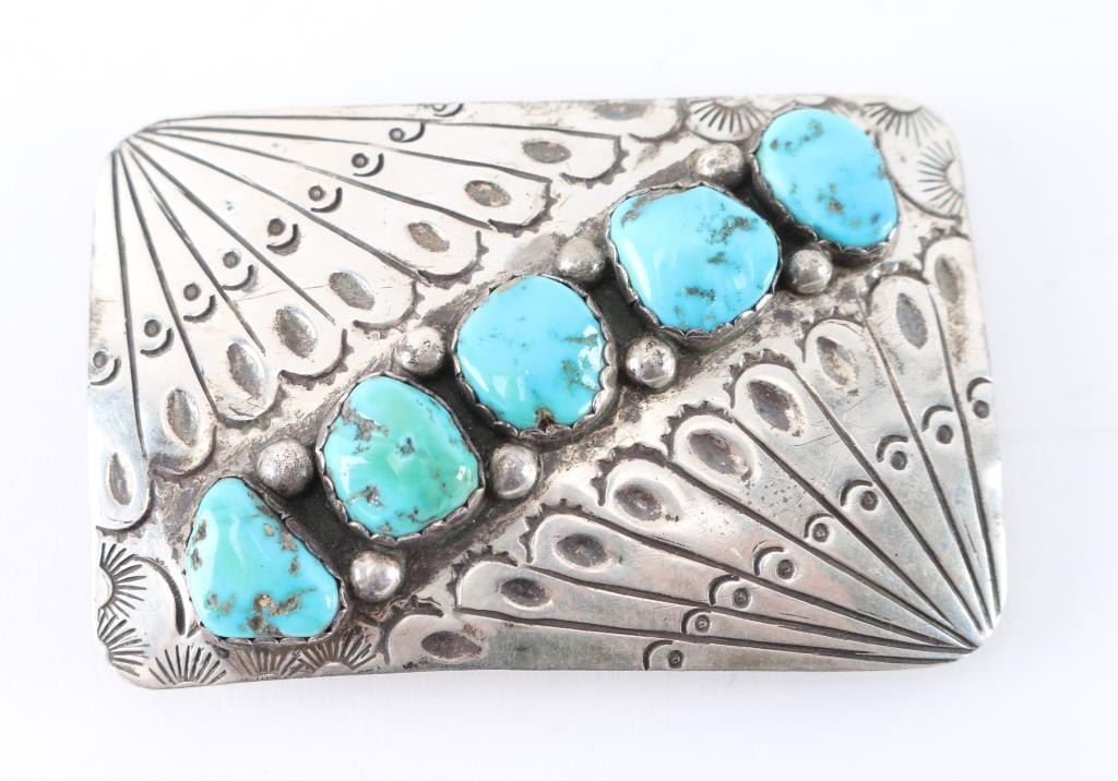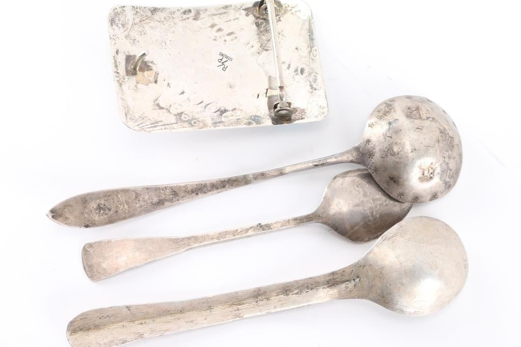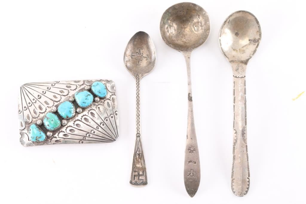 (1) Sterling silver belt buckle with 5 turquoise stones, maker marked RP with a lightening bolt, size 3 1/4" x 2". (3) Sterling silver spoons with native American designs.