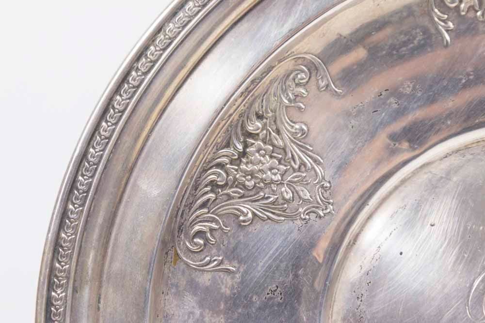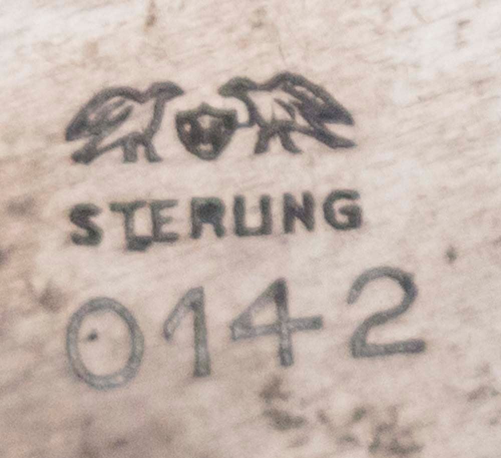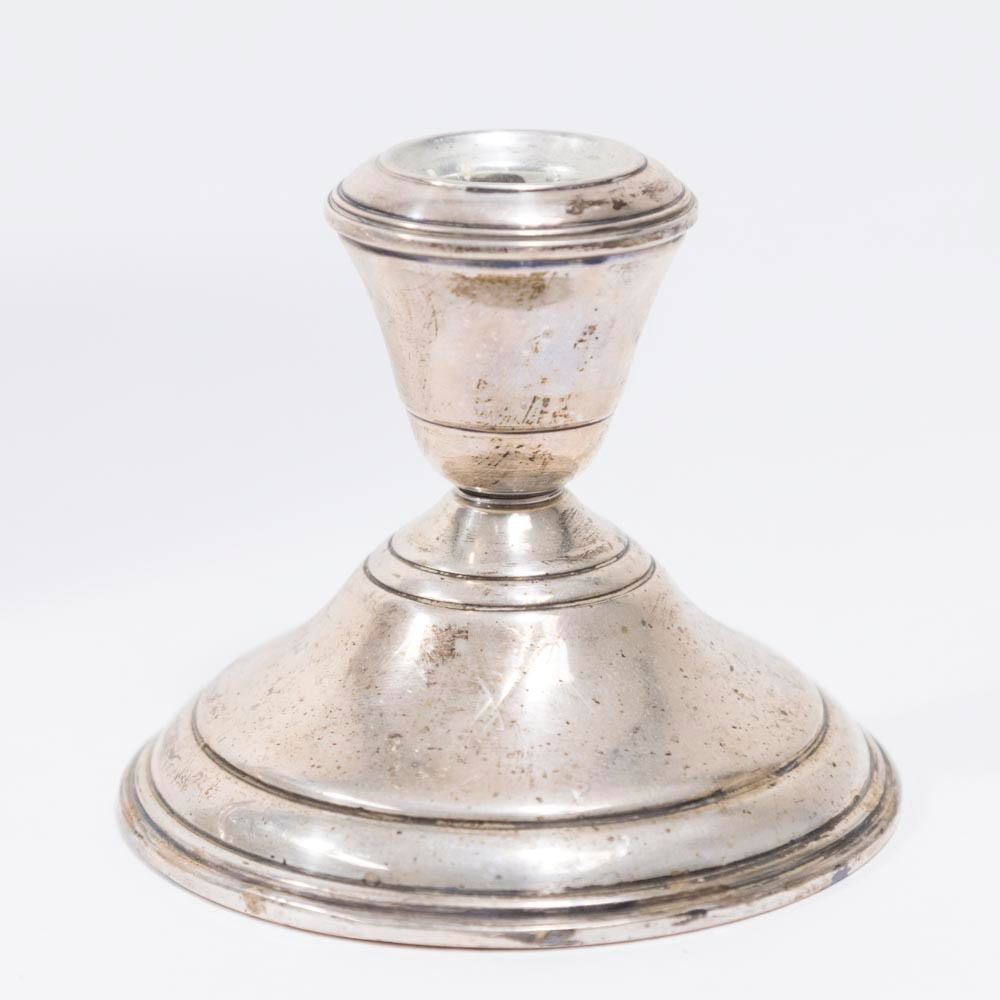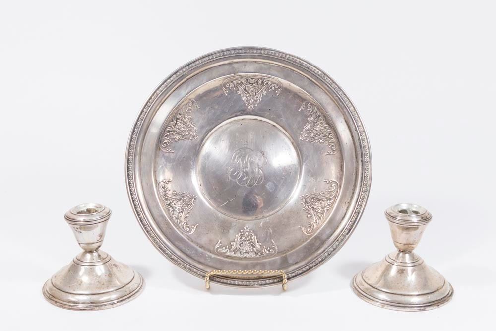 Including pair of weighted candlesticks and round tray. Tray approx. 9" diameter. Approx. 5 ozt. (5298)