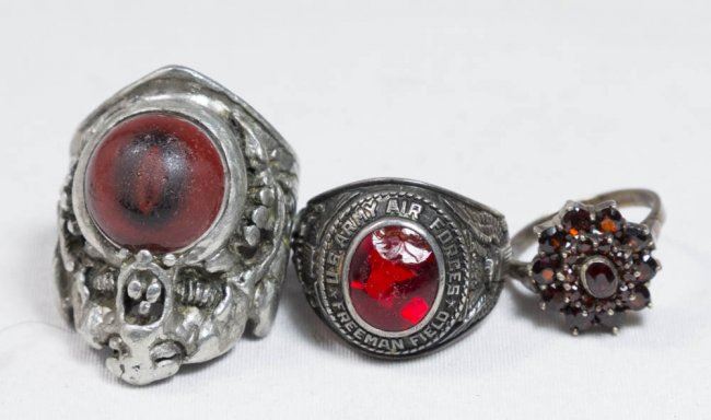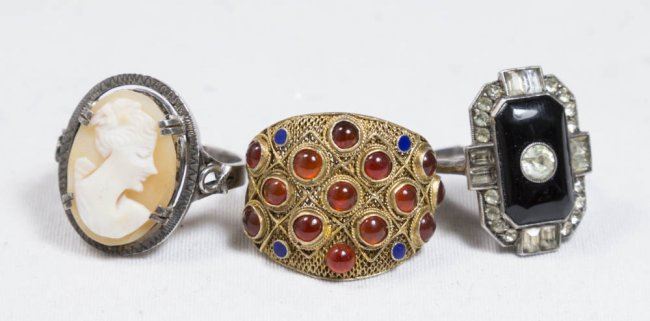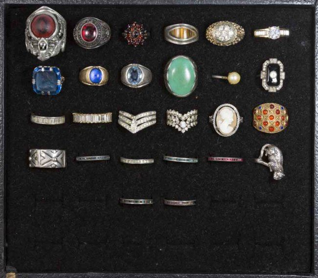 Approx. 26 total. Including cat form, skull, class ring, cameo, turquoise, etc. Some missing stones.