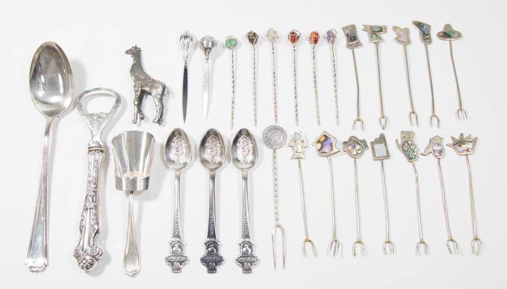 Including 3 Rolex souvenir spoons, sterling silver bottle opener, and more. Approx. 3ozt. (6060).