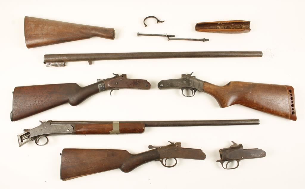 Lot of 5 single-shot shotgun receivers, some with barrels or stocks but none are complete shotguns. One N.R. Davis & Sons with broken tangs, One is a Harrington & Richardson Topper 158 with stock and recoil pad. One is a Central Arms with a 20 Ga barrel and forend with stock iron but no snap to hold it to the barrel. Two are Iver Johnson Champions one has a broken stock and one is missing internal parts. If blued, the finish has faded to a patina. If color cased the colors have faded. There are some with deep pits and others with rust stains. Also includes a loose barrel, stock, 2 stock bolts, a split and repaired forend and a trigger guard.