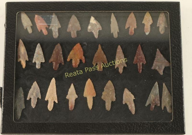 Neolithic Stemmed points, estimated age 1,000+ years according to consignor. Unknown origin. 26 total points in Riker case. Offered "as is", we don't guarantee the authenticity of this item, please do your research. All sales are final.