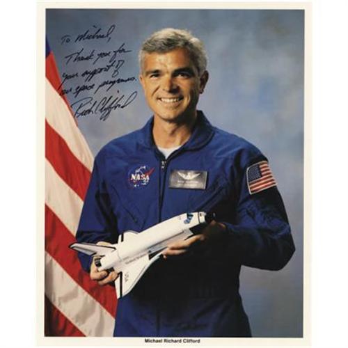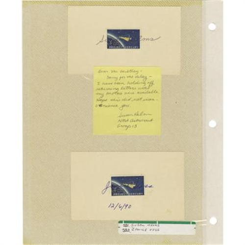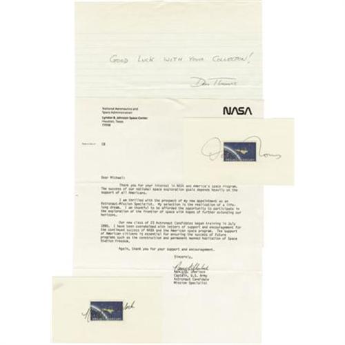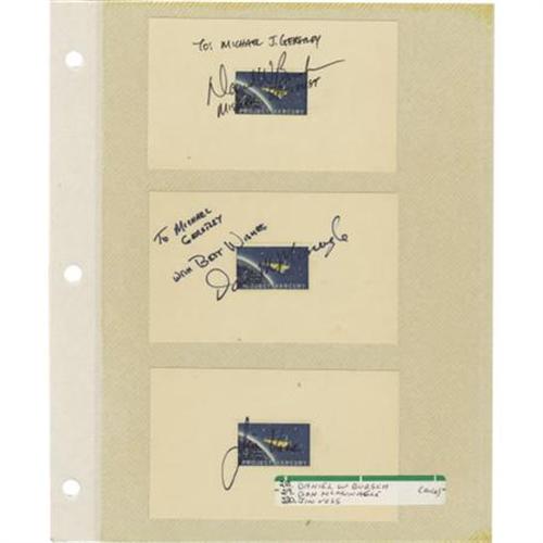 <B>Lot of Ten Astronaut and Test Pilot Signatures,</B></I> including: Daniel Bursch, Don McMunagle, Jim Voss, Susan Helms, Janet Voss, Michael Clifford, Don Thomas, and Nancy Sherlock. Each signature is on or near a space related stamp mounted on a 5" x 3" card. Clifford also signed an official NASA photograph. Helm, Sherlock, and Thomas also signed notes. All cards, notes, and photo are in acetate album pages. All are very fine. <B></B></I><BR><BR><b>Shipping:</b> Flat Material, Small (<a target="_blank" href="http://www.heritageauctions.com/common/shipping.php">view shipping information</a>)